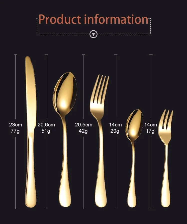 Высокое качество 20 шт./компл. набор столовых приборов 20 шт./компл. набор столовых приборов Материал: нержавеющая сталь Размер: основная knife-22cm,77 г основная spoon-20.6cm,51 г основная fork-20.5cm,42 г чайная spoon-14cm,20 г чая fork-14cm-17g настоящей нержавеющей сталью мы тщательно выбираем сталь для вас, которая не будет плесени или ржавчины. Мы несем ответственность за ваше здоровье. Ручная полировка хорошего уровня, высокая яркость, зеркальный блеск в течение длительного времени, без ржавчины, экологически чистая и многоразовая посуда без плесени-это наш принцип долговечная посуда в течение длительного времени и Попрощайтесь с некачественной посуды. Мы улучшим качество вашей жизни.