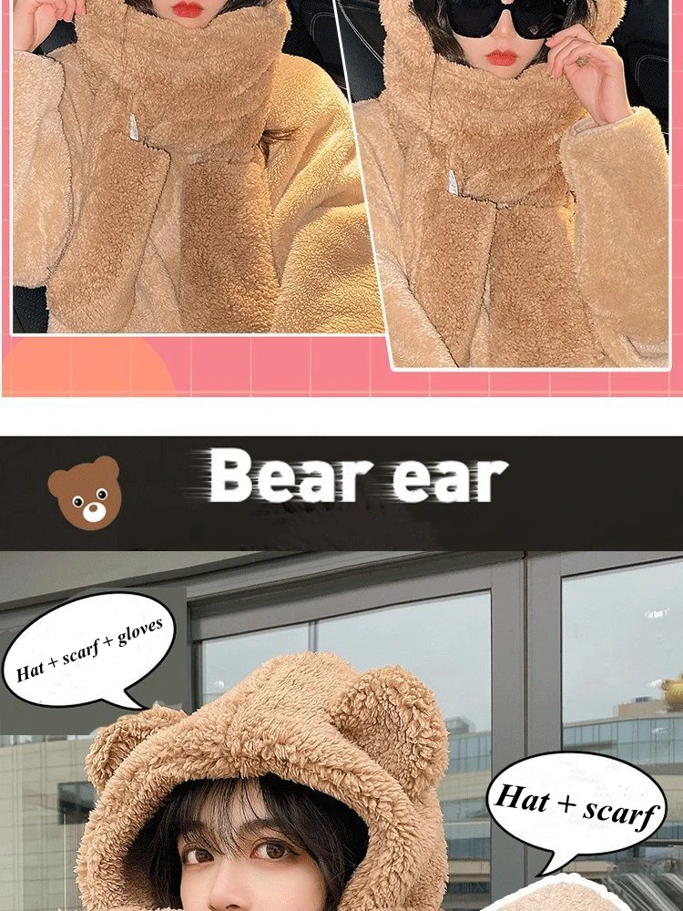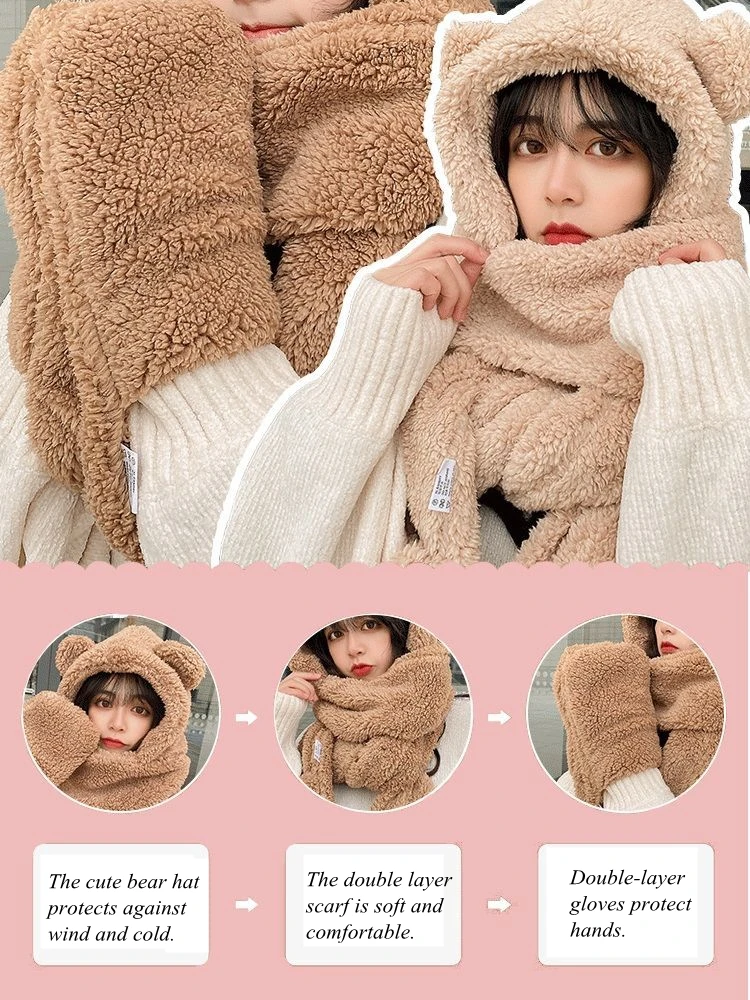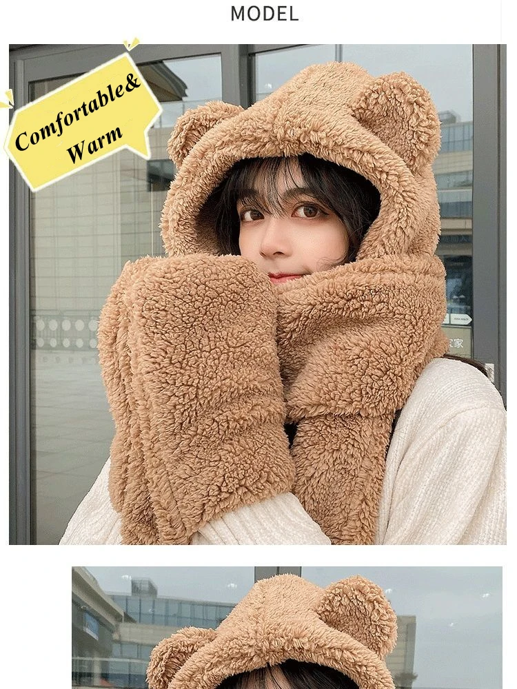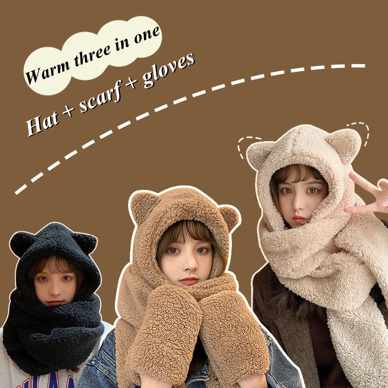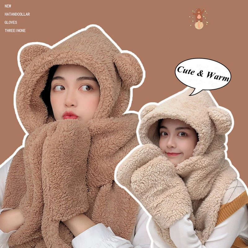 Женский вязаный модный мультяшный медведь Стиль Милая шапка ушанка из флиса, с капюшоном в виде Шляпы шарф шейные перчатки зима в одном стиле Три в одном для девочек и шляпа, хит продаж