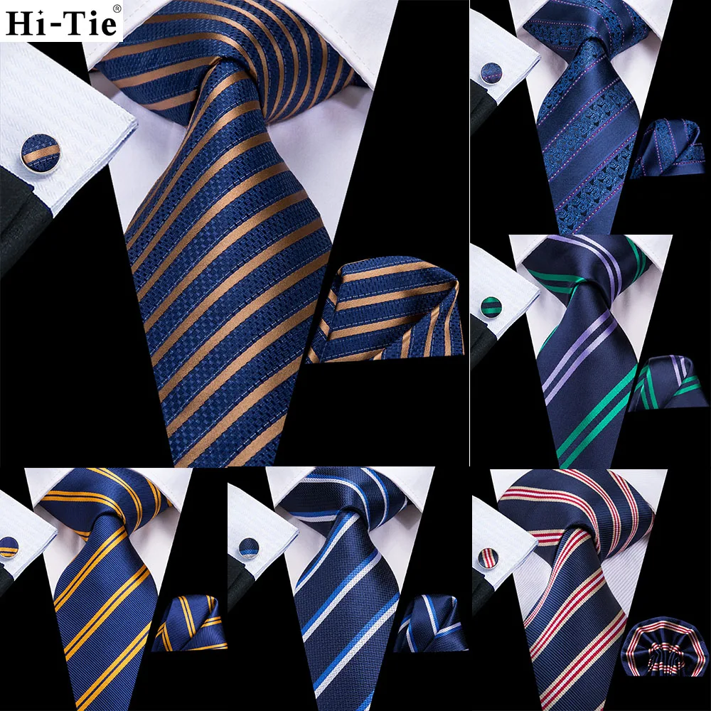 Hi-Tie подарок мужской галстук темно-синий полосатый Шелковый Свадебный галстук для мужчин Hanky запонки Набор Бизнес Вечеринка Прямая поставка модный дизайн