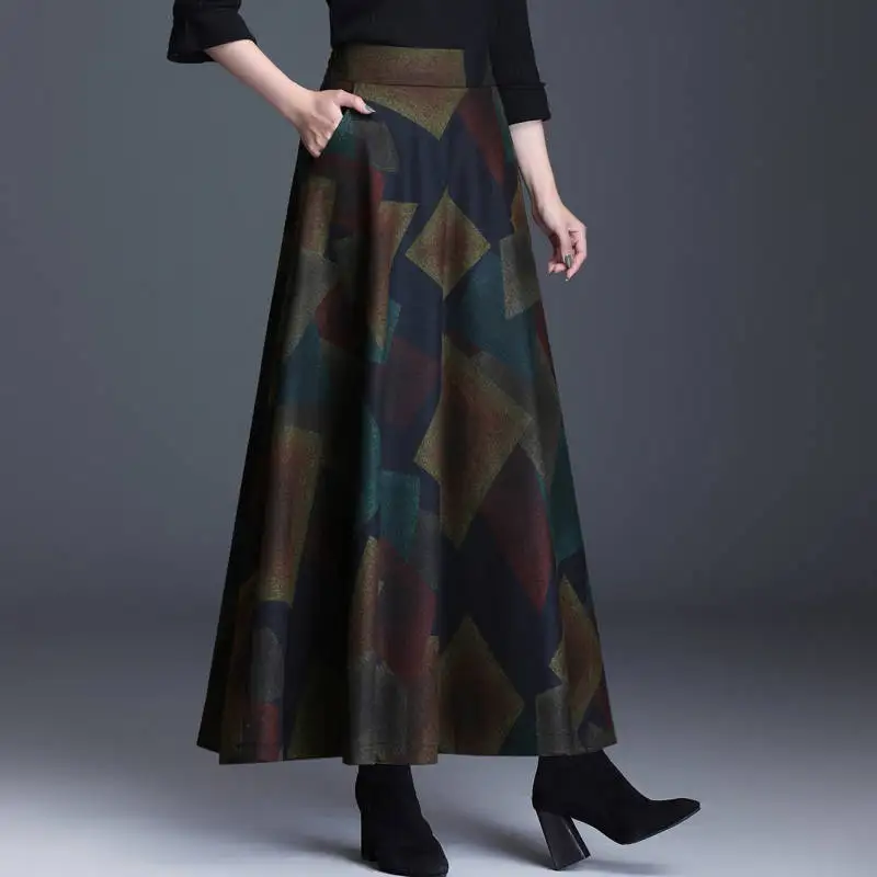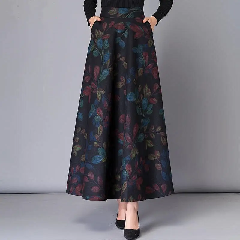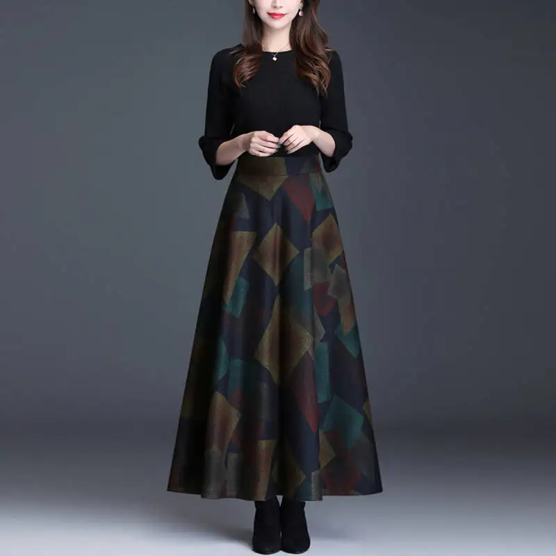 Шерстяная длинная трапециевидная юбка с принтом, с большим подолом, с высокой талией, Женская юбка