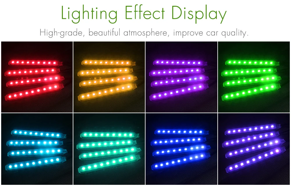 Особенность: 1) абсолютно новый и качественный 2) Это около одного набора светильник льников, включая 4 светильник, один прикуриватель и один пульт дистанционного управления. 3) Простой дизайн для красивого, экзотического и романтичного интерьера. 4) для установки доступен двусторонний клейкий кран. 5) можно использовать на полу салона автомобиля или приборной панели. 6) Удаленная Функция: вкл/выкл, изменение цвета, изменение мигающего рисунка, изменение скорости мигания.