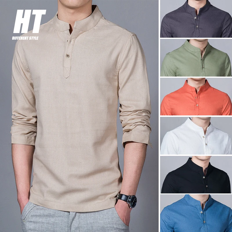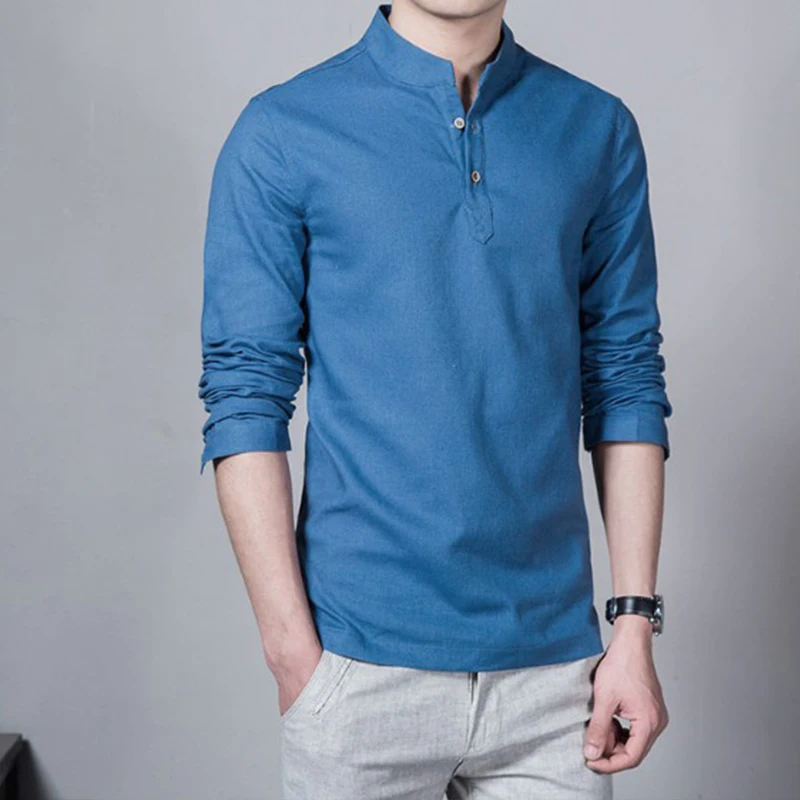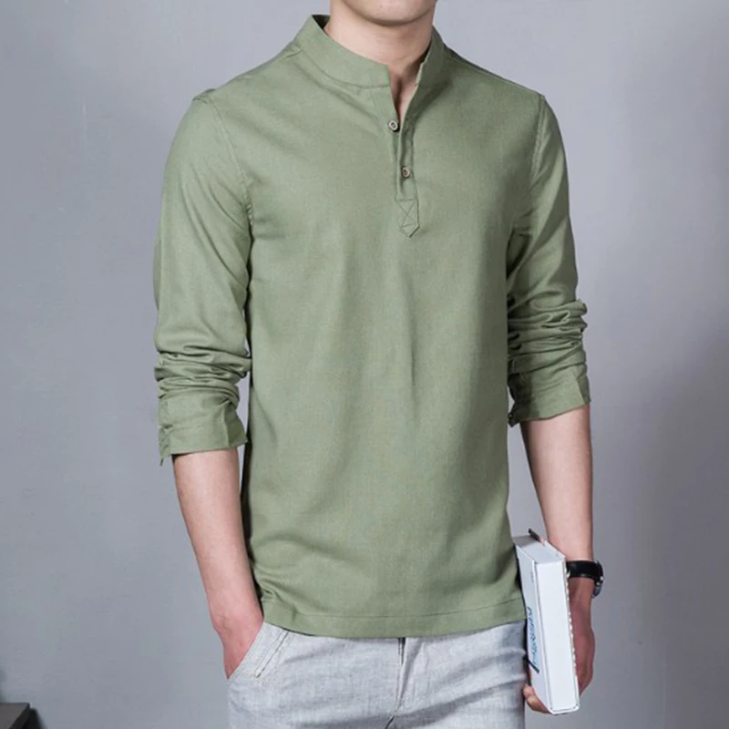 2021 новые мужские хлопковые льняные рубашки, повседневная приталенная пляжная рубашка, мужские модные рубашки высокого качества с длинным рукавом и воротником-стойкой, S-5XL