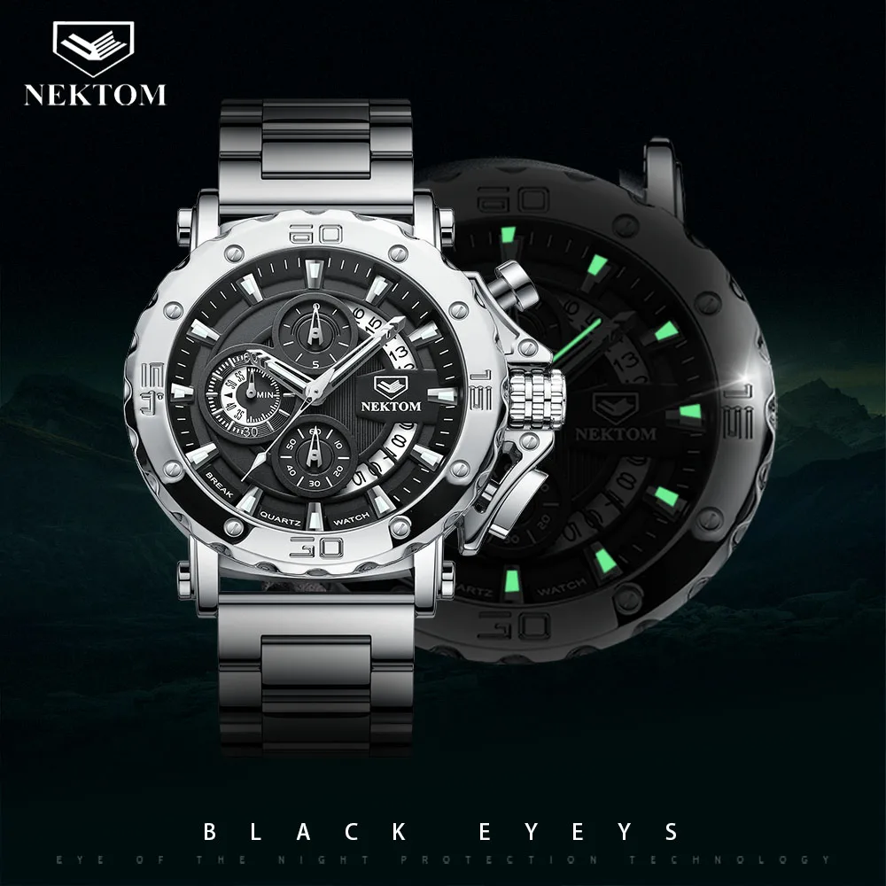 Часы наручные NEKTOM Мужские кварцевые, водонепроницаемые спортивные в стиле милитари, со стальным ремешком