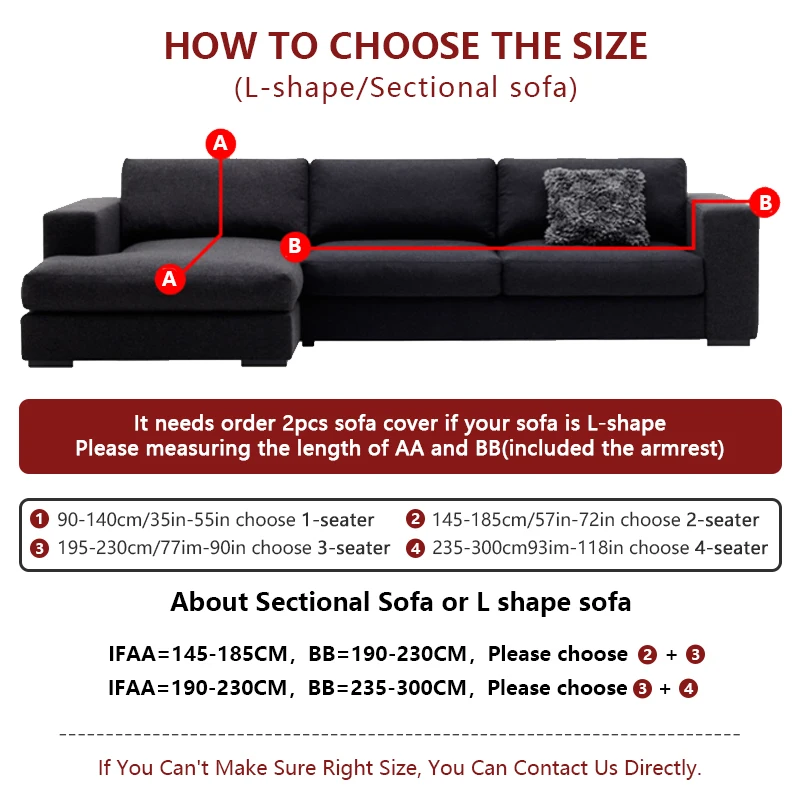 Пожалуйста, тщательно измерьте размер вашего дивана. Также учитывайте подлокотники. Если вы не берете во внимание подлокотники, чехол для дивана может не поместиться на диване.1. Для одноместного дивана, длина дивана должна быть в пределах 90-140 см2. Для двухместного дивана длина чехла дивана должна быть в пределах 145-185 см3. Для трехместных чехлов дивана длина дивана должна быть 195-230 см4. Для четырехместных чехлов дивана длина дивана должна быть 235-300 см5. Для секционного или углового дивана мы предлагаем приобрести 2 чехла. Размер чехла будет зависеть от длины линий AA, BB и CC.Например: если AA = 200 см, BB = 160 см, то вам следует выбрать 1 Трехместный Чехол для дивана и 1 двухместный Чехол для дивана.