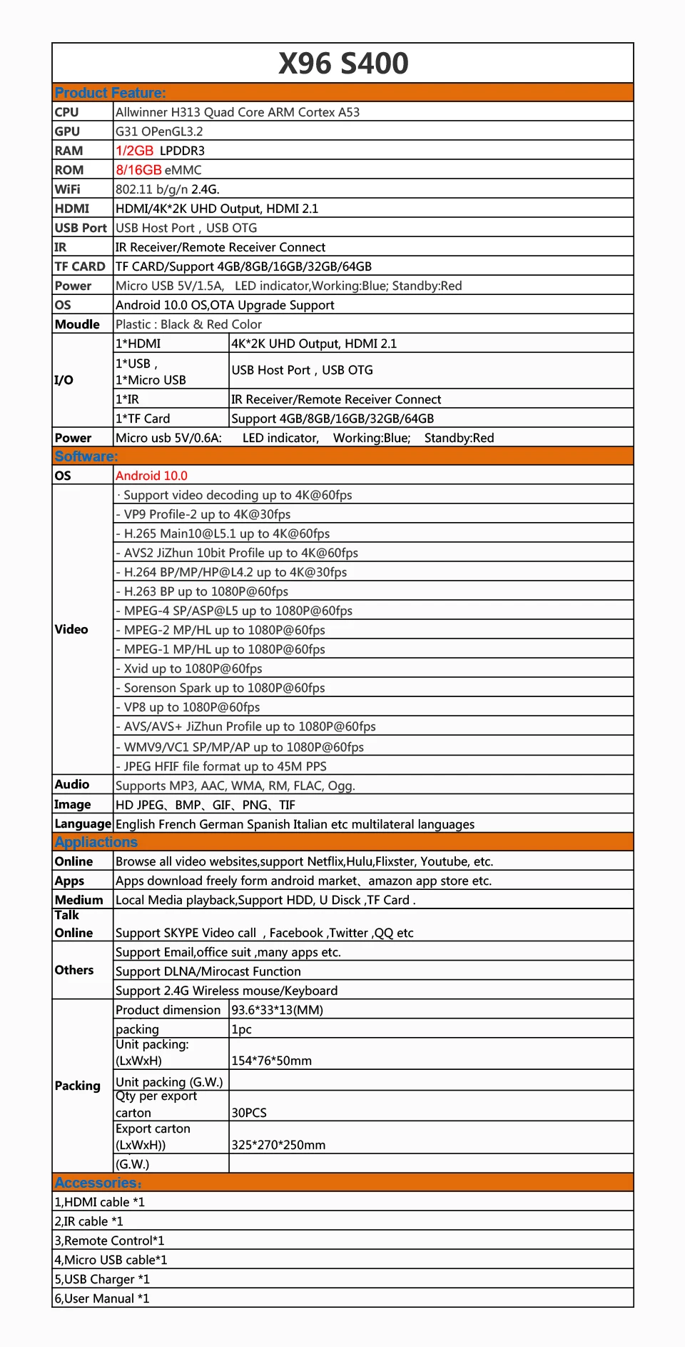 10 шт.партия, ТВ-приставка X96 S400, 2 ГБ, 16 ГБ, 1 ГБ, 8 ГБ, Andro...