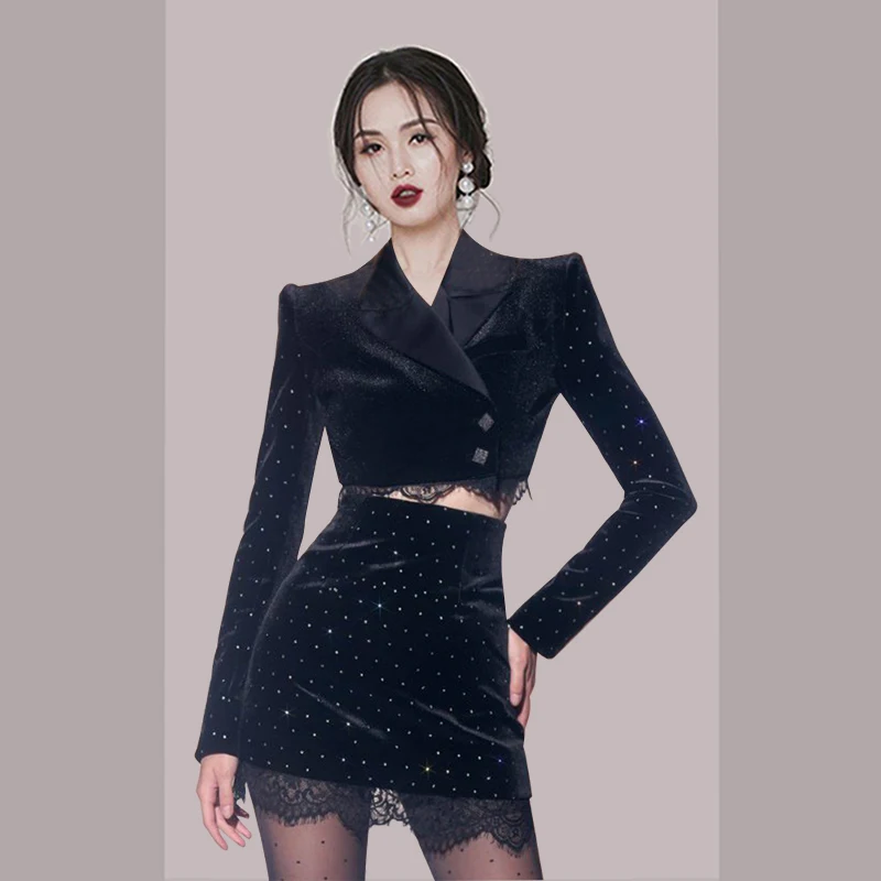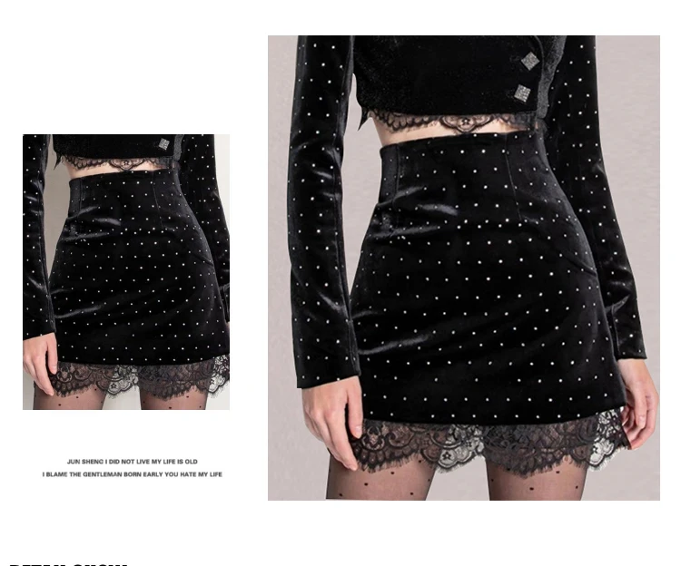 Женский бархатный костюм из двух предметов, короткая куртка с длинным рукавом и английским воротником и кружевная мини-юбка с высокой талией в ретро-стиле