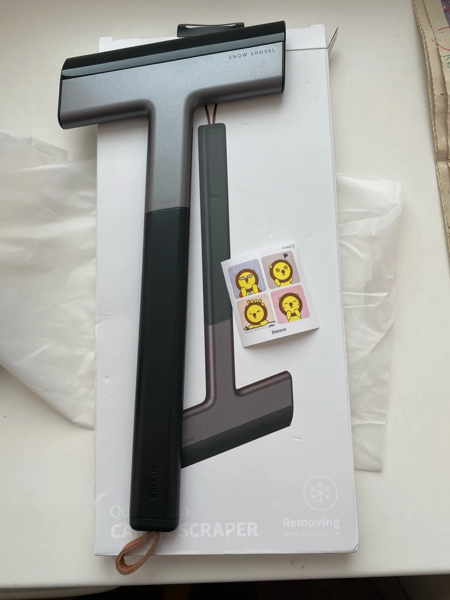 просто великолепно упакованная, очень красивая, приятная на ощупь хрень. Продавец положил наклейки. Это совершенство дизайна не имеет недостатков кроме одного. Лед не чистит, так как скребок из резины, а она плохо скользит. Но зато как висит на кожаной петельке!