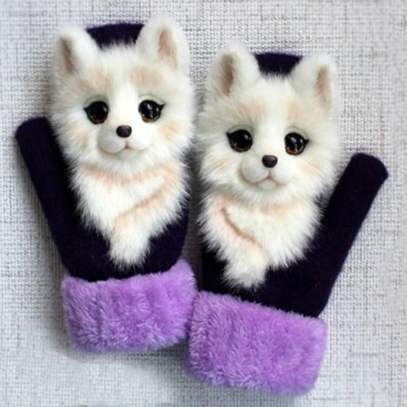Женские и мужские искусственные Милые 3D пушистые Мультяшные животные Декор утолщенная плюшевая подкладка ветрозащитные теплые варежки