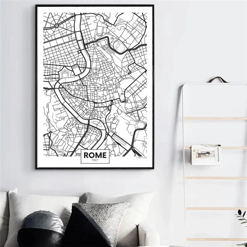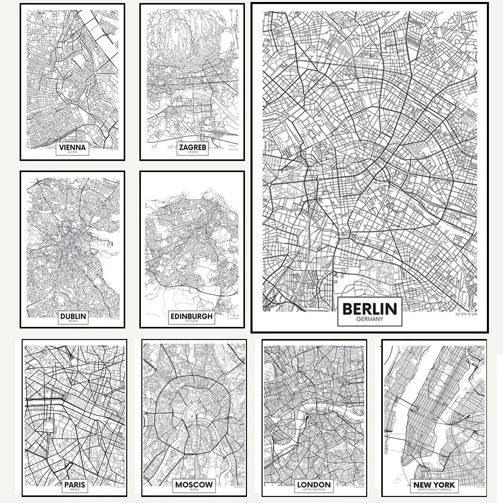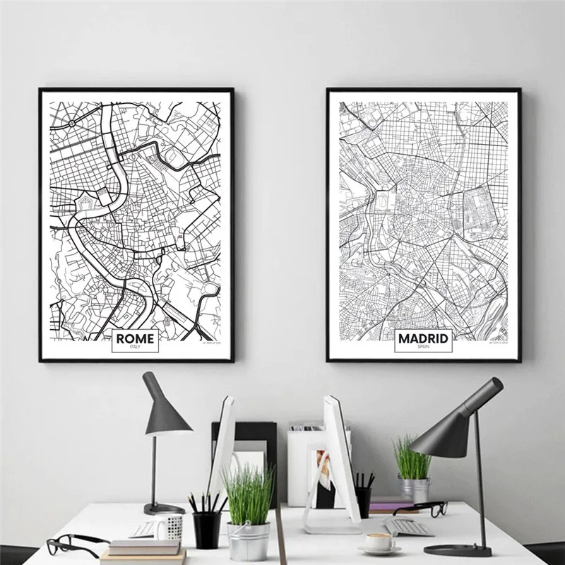 Черно-белая карта городов мира, Нью-Йорк, Токио, Париж, холст, карт...