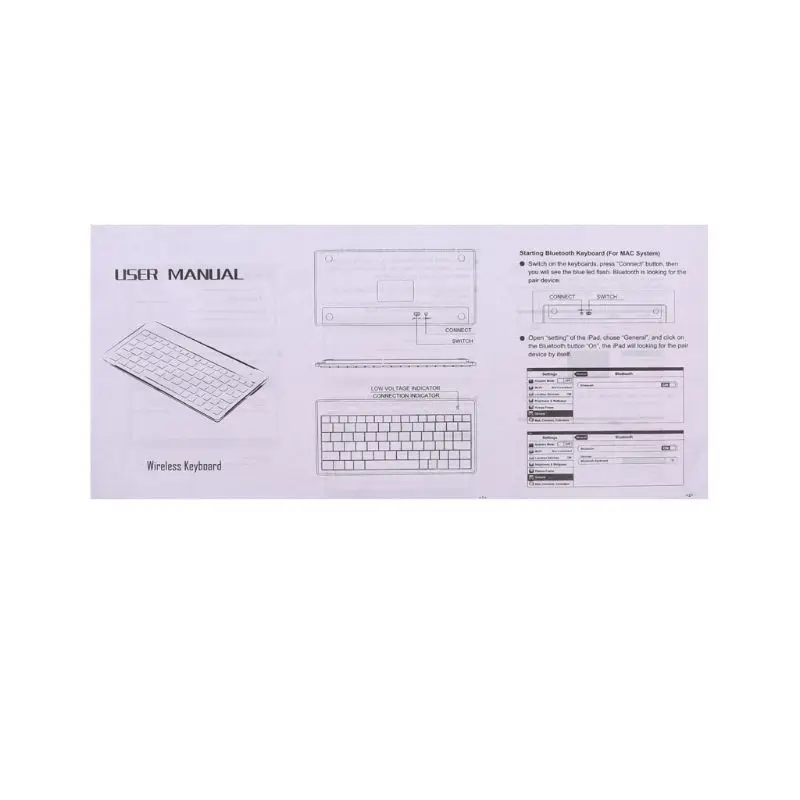 Особенности:OOTDTYЭта bluetooth-клавиатура для ноутбука, планшета, мобильного телефона с функцией bluetooth, без usb-приемника, если ваши устройства без Bluetooth, не может использовать эту клавиатуру1. Один дизайн клавиатуры, подходит для использования, светильник весит.2. Кнопки из АБС-пластика, кнопки, удобные и легко печатаются3. Версия Bluetooth 3,0, стабильное соединение, сильный сигнал.4. Универсальная bluetooth-клавиатура, поддержка системы ios, системы droid, системы windows.Совместим с i-Pad, ноутбуком, мобильный телефон, планшетом, настольным компьютером, ноутбуком, ноутбуком с функцией Bluetooth. Спецификация:1. 78 клавиш с 12 многофункциональными клавишами.2. Материал: АБС-пластик3. Количество клавиш: 78 (ключ)4. Чип Bluetooth и версия: Bluetooth5. 2x Питание от батареи типа ААА питания (не включая)8. Расстояние: 10 метров9. Размер: 28,5X12 см10. Цвет: белыйПосылка включает в себя:Мини-клавиатура 1 шт.1 шт. руководство
