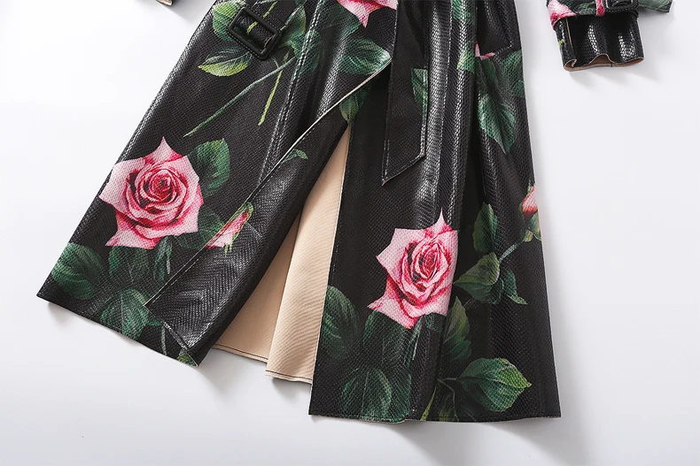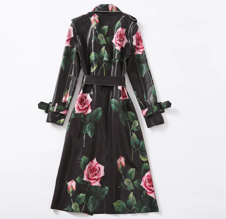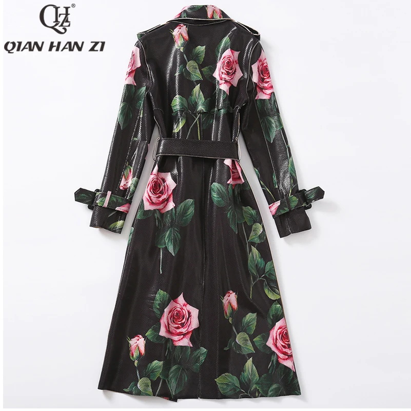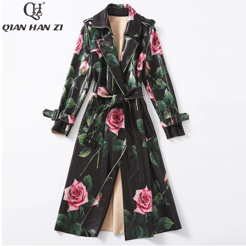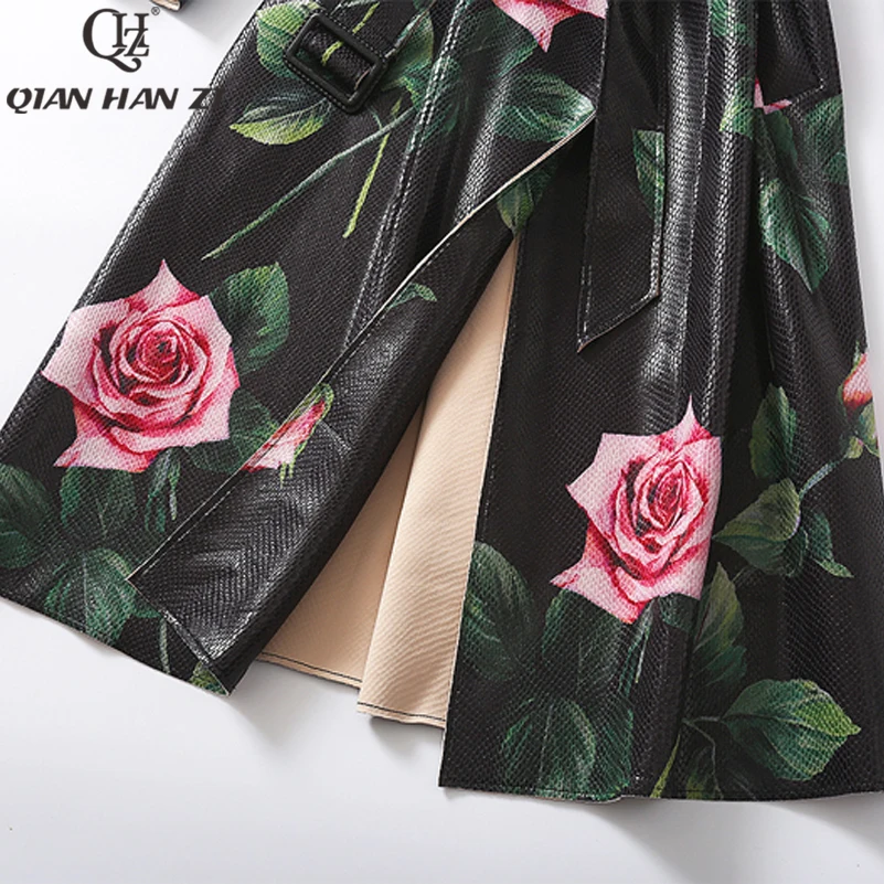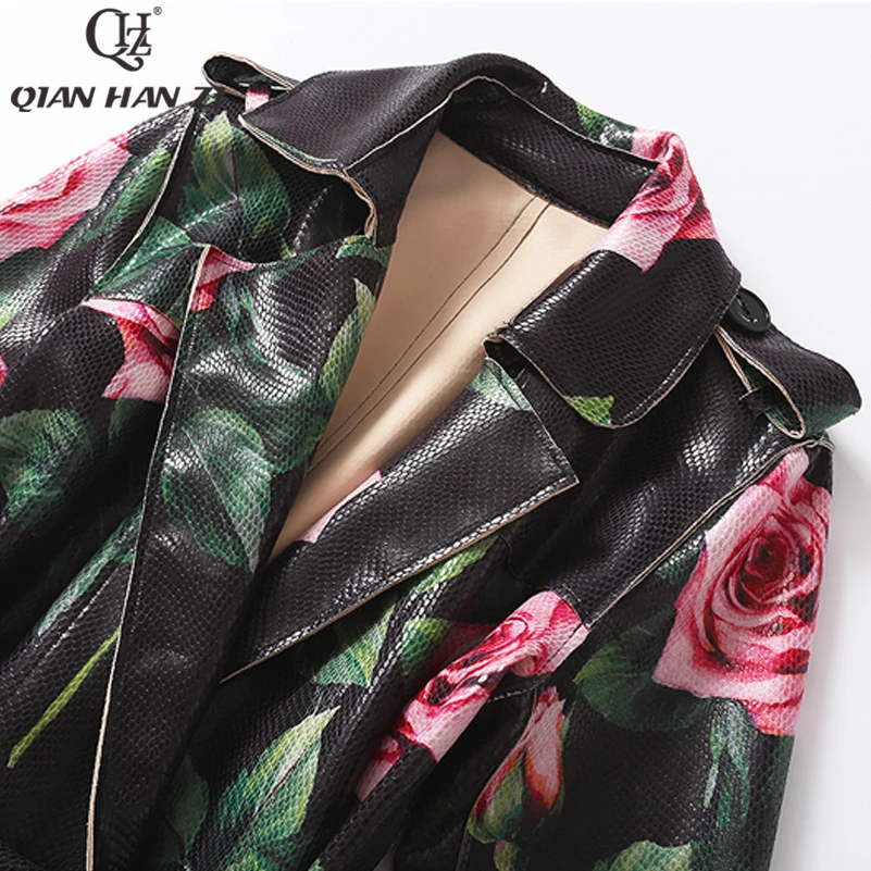 Qian Han Zi Новый Дизайнерский Модный яркий кожаный Тренч с цветочным принтом женское винтажное длинное тонкое пальто с длинным рукавом и розами