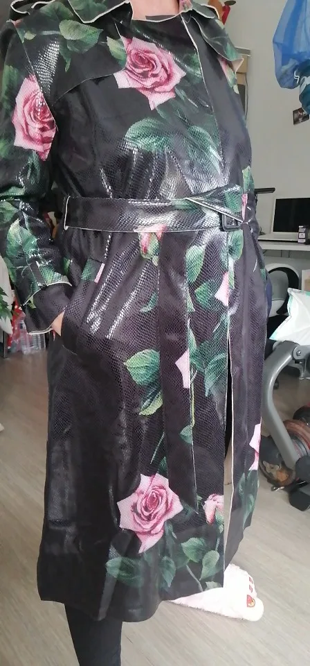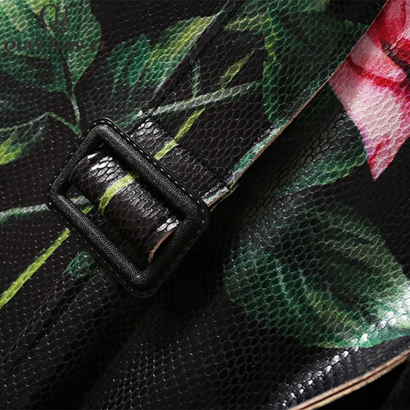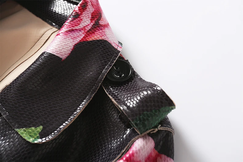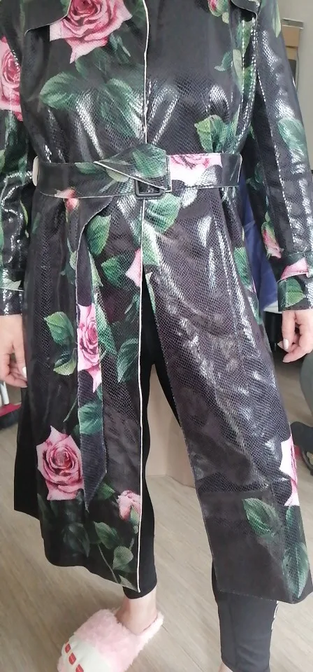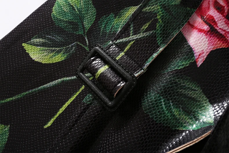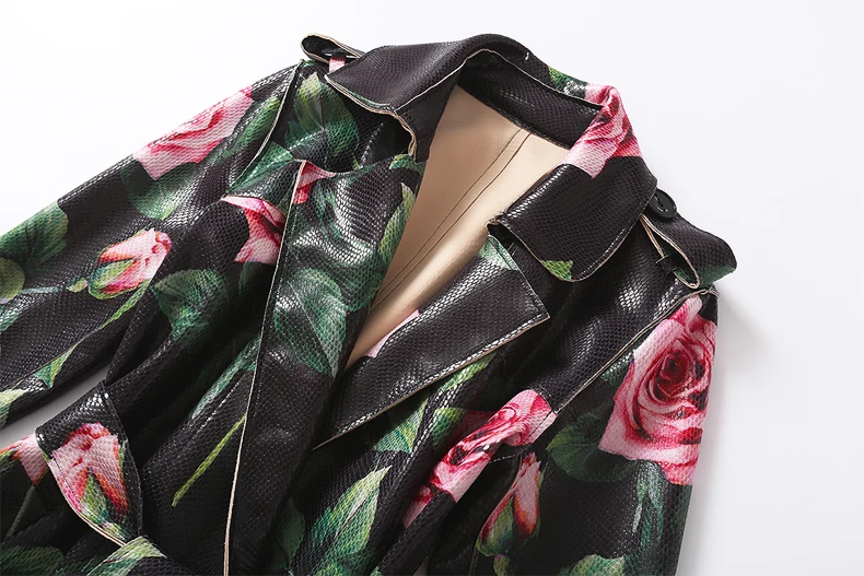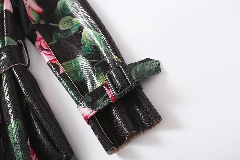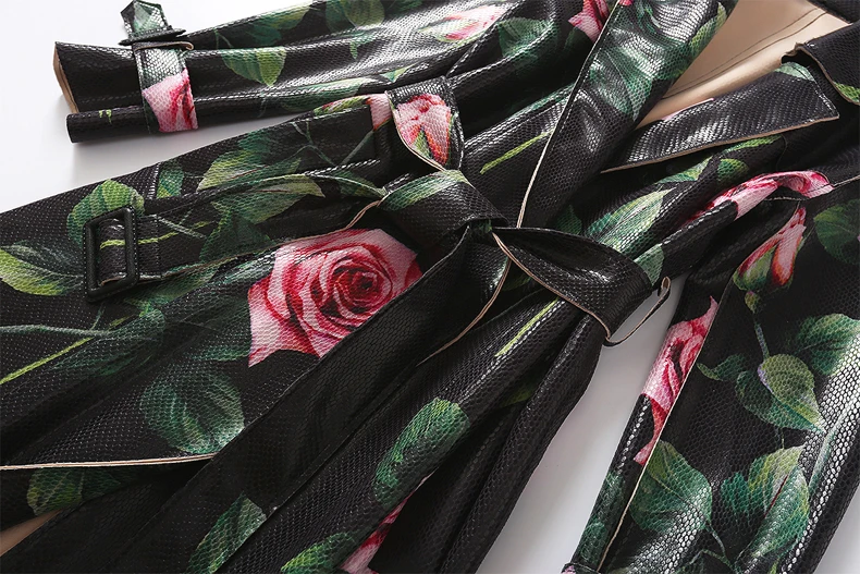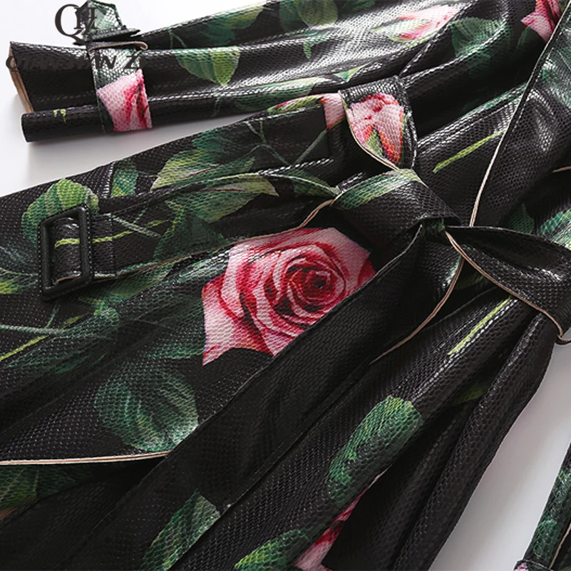 Qian Han Zi Новый Дизайнерский Модный яркий кожаный Тренч с цветочным принтом женское винтажное длинное тонкое пальто с длинным рукавом и розами
