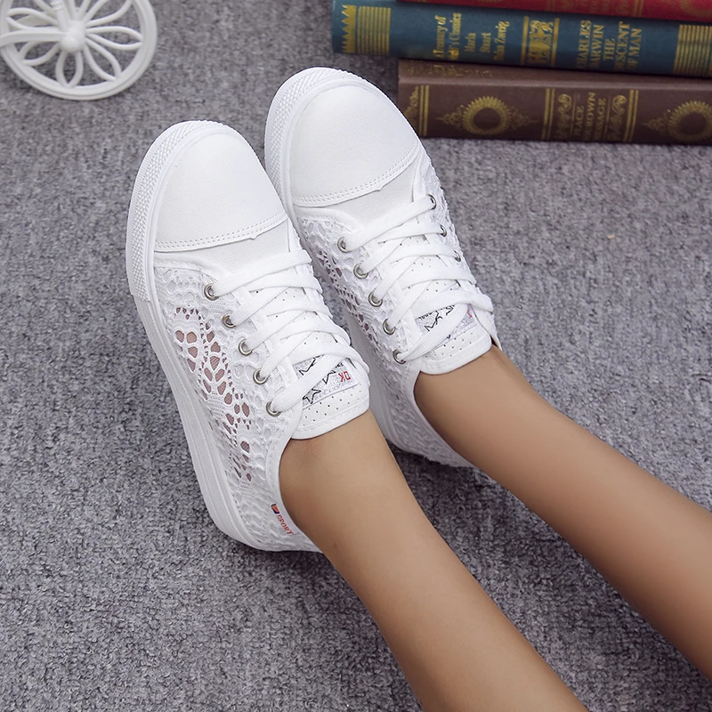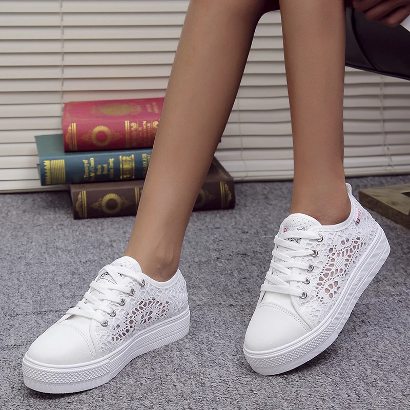 Женская обувь, Летняя Повседневная Белая обувь, кружевные парусинов...