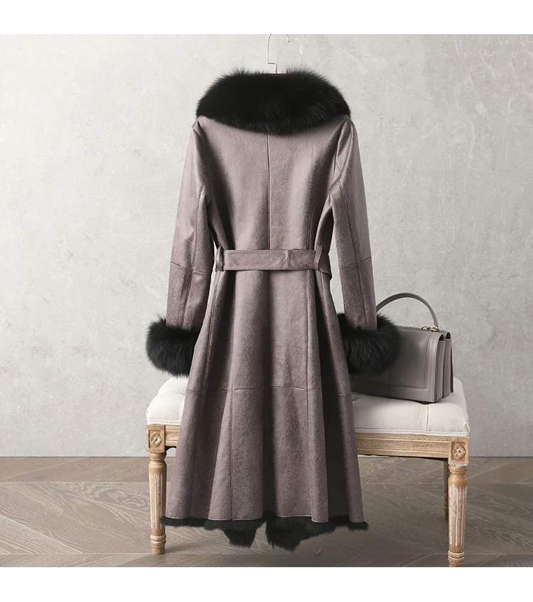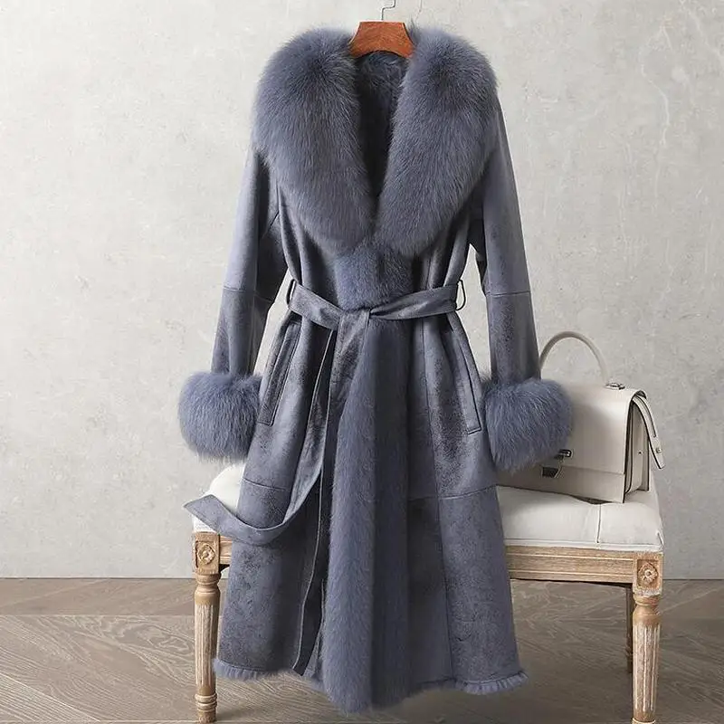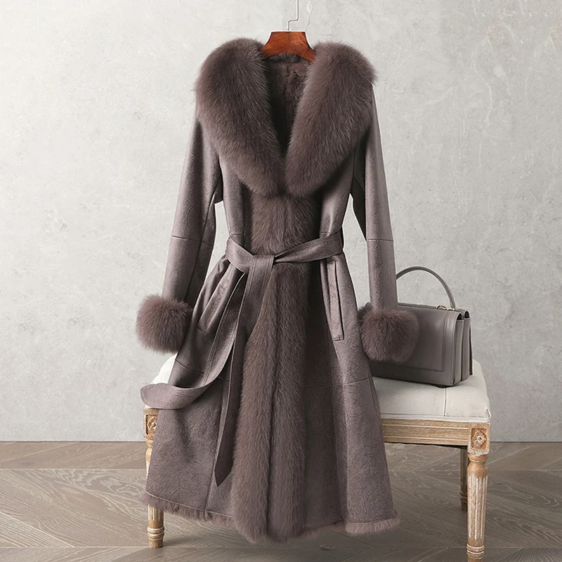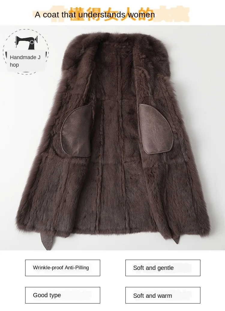 Новинка 2021, пальто из натурального двухстороннего кроличьего меха, женская зимняя облегающая одежда средней длины с воротником из лисьего меха и манжетами