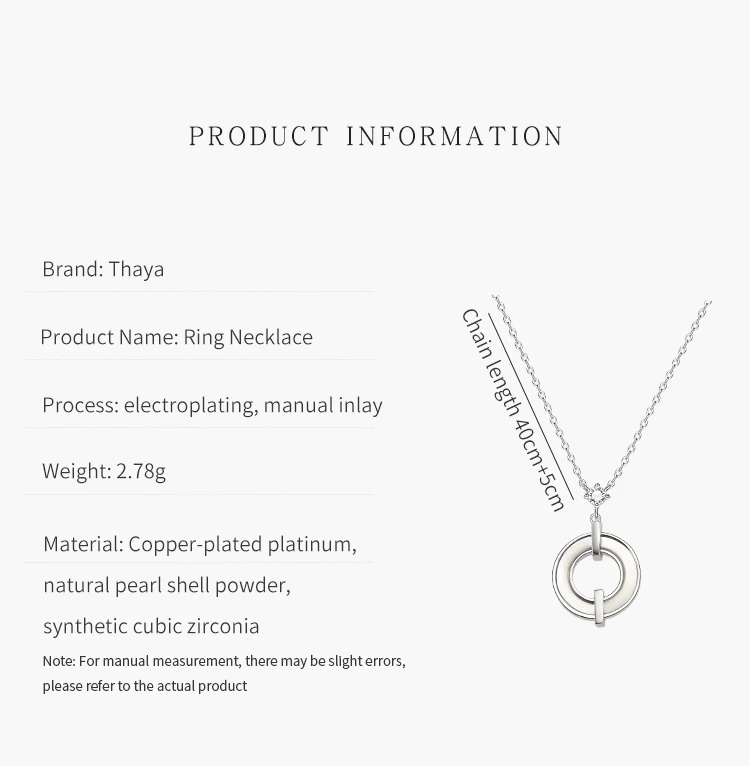 Бренд: Thaya Название продукта: кольца ожерелье Материал: платина с медным покрытием, натуральный жемчуг, порошок раковины, синтетический фианит Процесс: Гальваническое покрытие, Ручная инкрустация Вес: 2,78 г Длина цепочки: 40 см + 5 см Примечание: При ручном измерении возможны незначительные погрешности, пожалуйста, обратитесь к фактическому товару