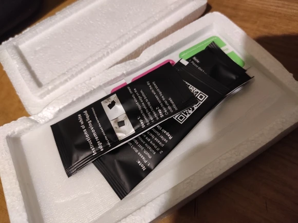 Стекла в упаковке с другими мелочами пришли раньше чем смартфон для них. в упаковке 3 штуки, салфеточки и клей (не знаю зачем он нужен, но вроде им промазывают края)
