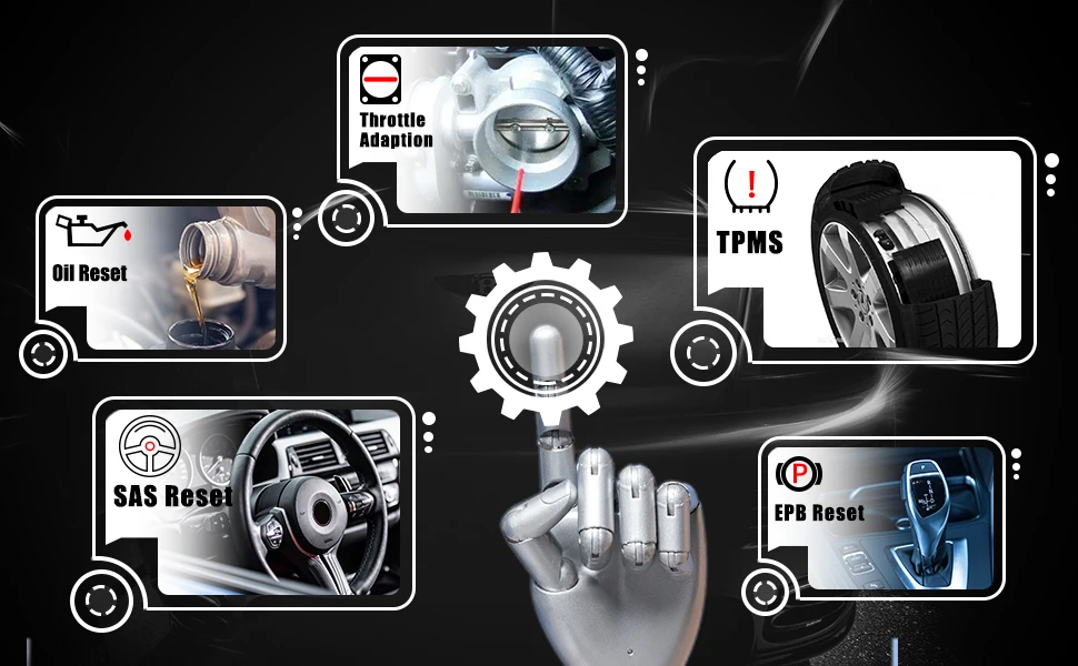 Масляный сервисный светильник Сброс:Позволяет выполнить сброс пройденного Расстояния обслуживания и интервалов данных для нового расчета системы жизнедеятельности моторного масла после изменения масла.Электронный сброс тормозных колодок EPB: важно поддерживать безопасность и эффективность электронной тормозной системы при замене тормозных колодок или двигателя.Сброс датчика рулевого управления SAS: помогает очистить воспоминания о датчике угла поворота и играет важную роль в калибровке датчика угла поворота руля.Электронный сброс положения дроссельной заслонки: Датчик положения дроссельной заслонки транспортного средства подключен к шпинделю бабочки и в основном используется для контроля положения дроссельной заслонки в двигателе внутреннего сгорания. Из-за его расположения Датчик положения дроссельной заслонки способен эффективно наблюдать, где расположен Дроссельный клапан.Сброс системы давления в шинах: Сервис имеет смысл в отображении сенсорных идентификаторов из ECU транспортного средства, ввод TPMS сенсорных сменных идентификаторов и датчиков тестирования.