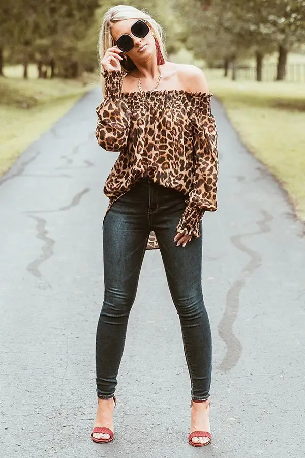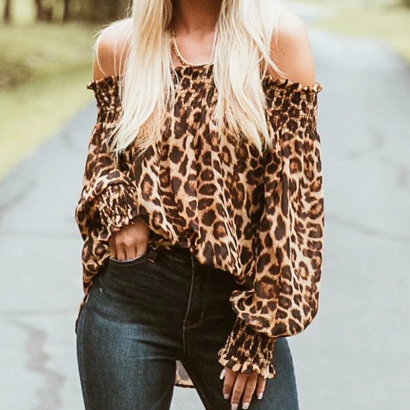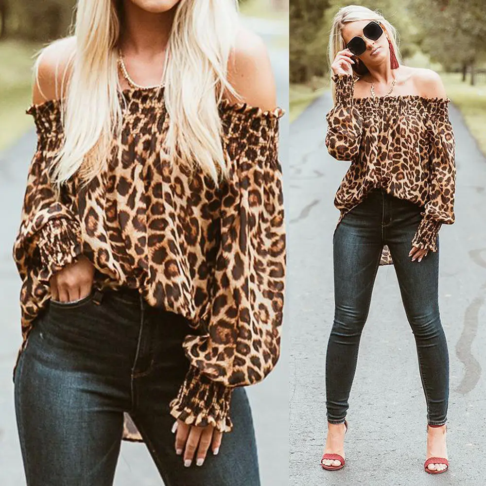 Женская блузка с открытыми плечами, с леопардовым принтом и длинными рукавами