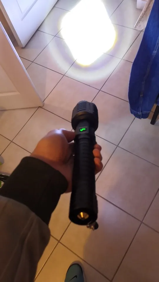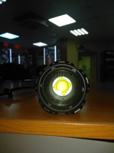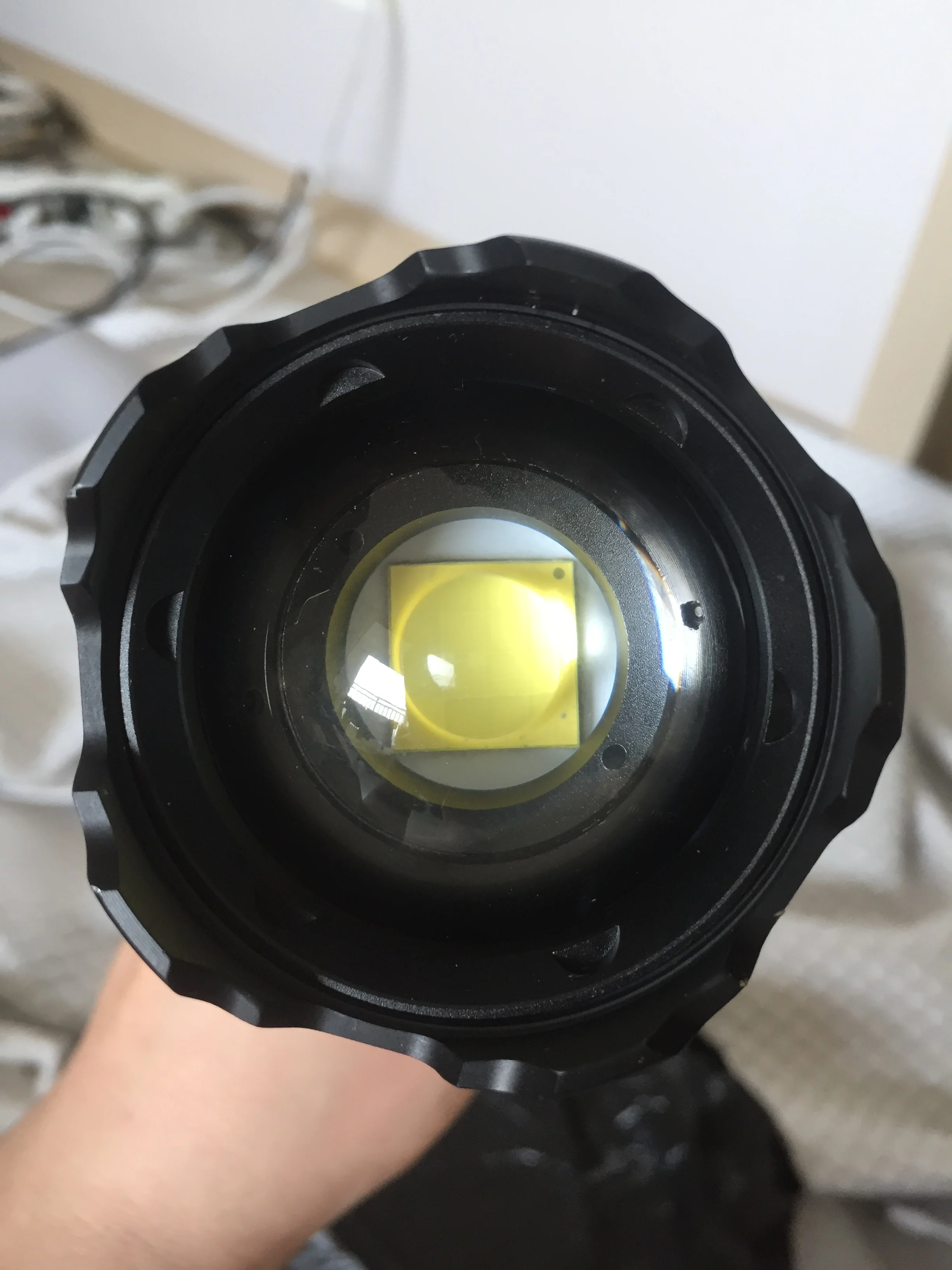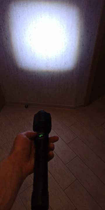 Друзья! получил посылку и сразу же спешу оставить отзыв. начнём с того что продавец отправил заказ мгновенно! доставка была молниеносная и составила менее двух недель в Россию. упаковано в воздушный пакет типа "фуфайка" , в заводскую коробку и сам фонарь в пупырку, всё надёжно защищено от повреждений. сам фонарь с первого взгляда внушает доверие. держишь в руках и понимаешь что денег он этих стоит. резьбы смазаны силиконовой смазкой, ход зума плавный и без люфта. я заказывал самый скромный комплект без аккумуляторов и без зарядки и поэтому для проверки использовал свои 18650. светит фонарь очень ярко! это самый яркий фонарик из всей моей коллекции , свет жёсткий белый скорее всего 6000 к. само тело фонаря сделано из дюралевого сплава и под рукой силиконовая вставка, это очень удобно! фонарь не скользит в руке и если будет 6реться то руке будет комфортно его держать. на фото вес фонаря с аккумуляторами 18650, и для сравнения луч в потолок , потолочный светильник просто блекнет.