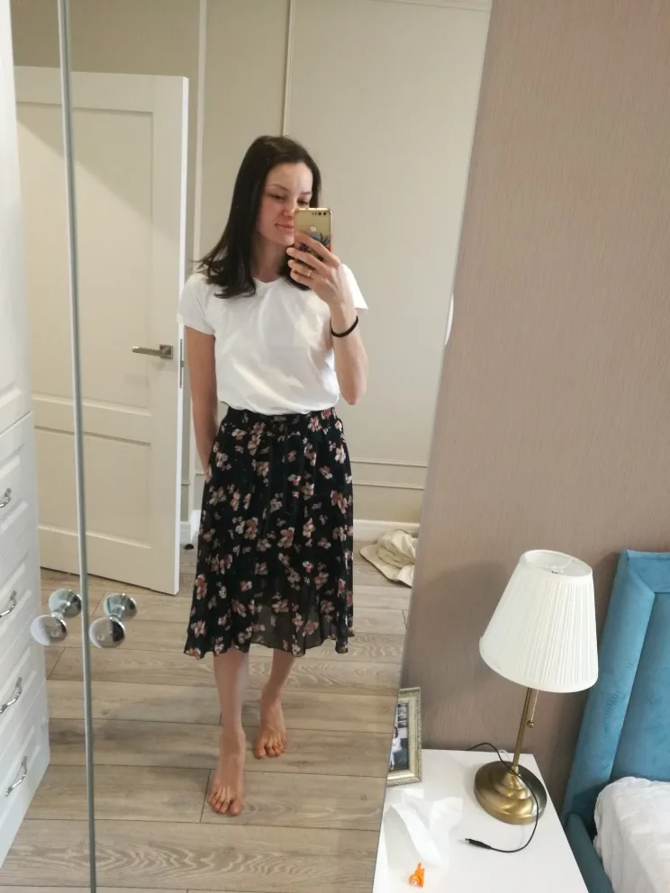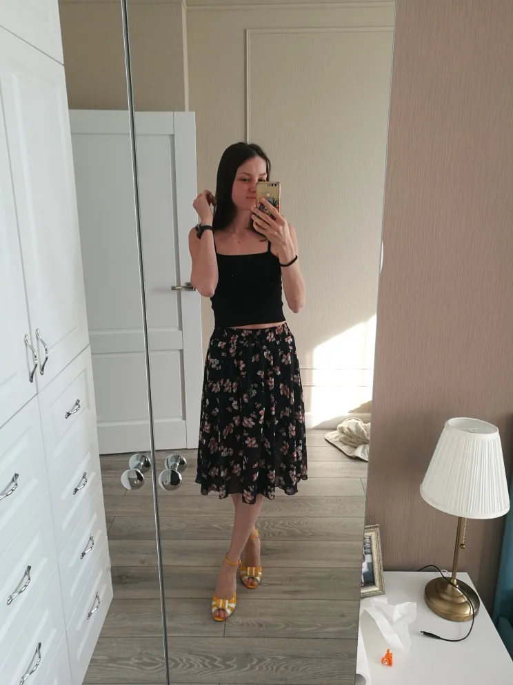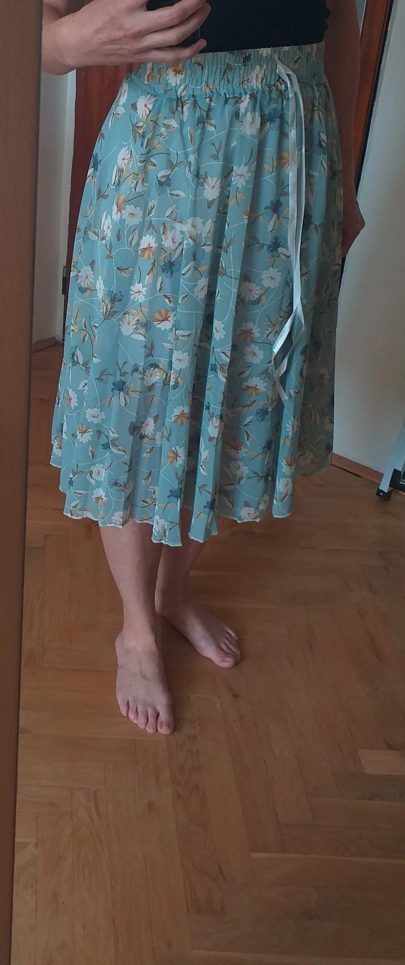Отличная юбка! Струящаяся, лёгкая. На подкладке. Доставка быстрая, две недели до Москвы. Не угадала с размером. На обхват талии 67 см заказанный размер мал, в нем 60см.Продавец вернул 50% стоимости. Мой рост 173. Длина по колено. Закажу ещё!