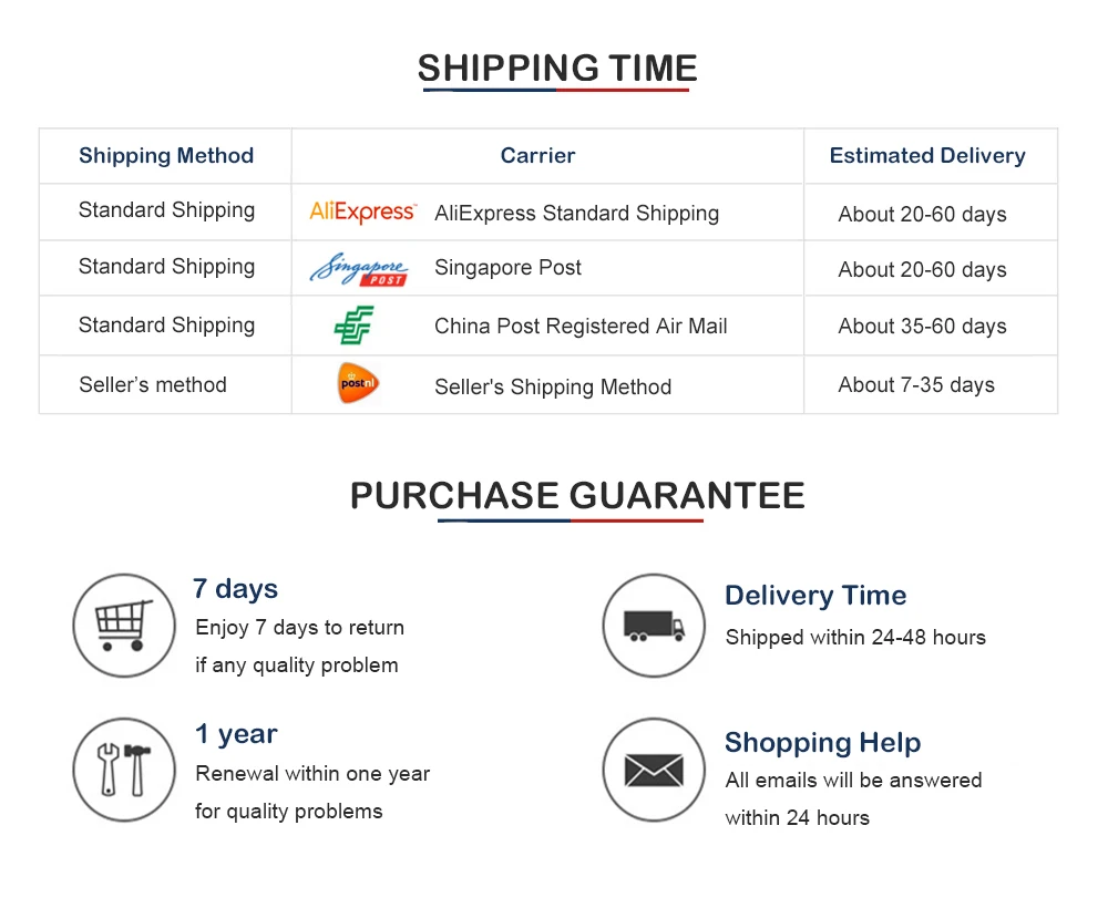 Защита покупателя:1. Полный возврат или повторная отправка, если вы не получили ваш заказ.2. Полный или частичный возврат, если товар не соответствует описанию.Своевременная доставка:1. Гарантированный товар будет отправлен в течение 3 дней. Обычно товар отправляется на следующий день после оплаты.2. Гарантированный товар будет доставлен в течение 60 дней. Обычно Доставка осуществляется в течение 2-5 недель. (Для Бразилии, гарантированное время составляет 90 дней, и предполагаемое время доставки 5 ~ 8 недель).Если возникнут какие-либо проблемы, пожалуйста, свяжитесь с нами, мы поможем вам решить их.
