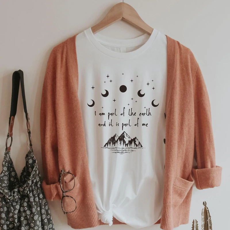Женская футболка в стиле бохо I Am Part Of The Earth, футболка с изображением луны и звезд, подарок для любителей природы, Женские топы для занятий на открытом воздухе