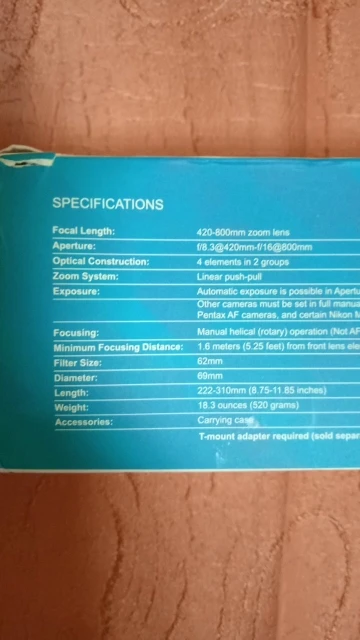 Всё ок. Товар отправлен и доставлен очень быстро - 2 недели. Не ожидала, спасибо. Упаковано всё качественно. Товар соответствует описанию. Качество товара хорошее, работает в ручном режиме настройки для фотоаппарата Nicon D5600 с использованием адаптера, выписывала дополнительно у другого продавца, товары пришли одновременно, поэтому проверила в работе. Объектив подходит для съёмки далеко расположенных и малоподвижных объектов. Для получения хорошего качества снимков нужен штатив или сильные руки). Продавца рекомендую, была низкая цена + скидка дополнительному по купону, за что большое спасибо. Успехов и процветания!