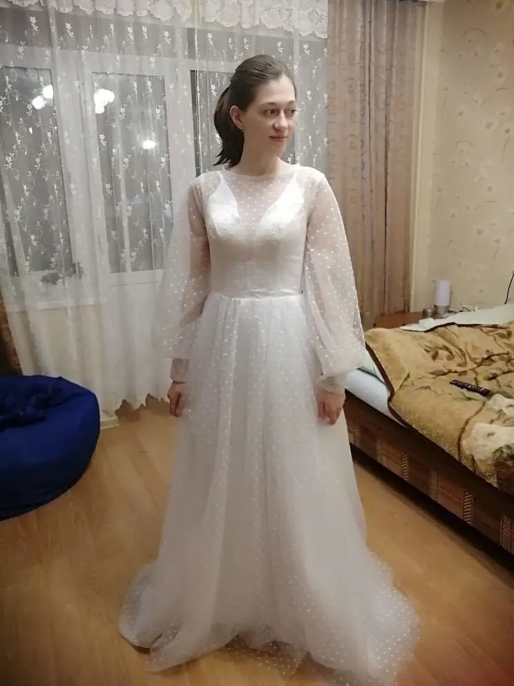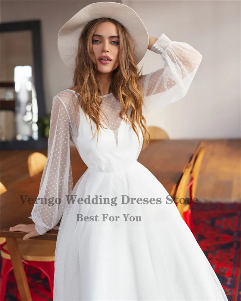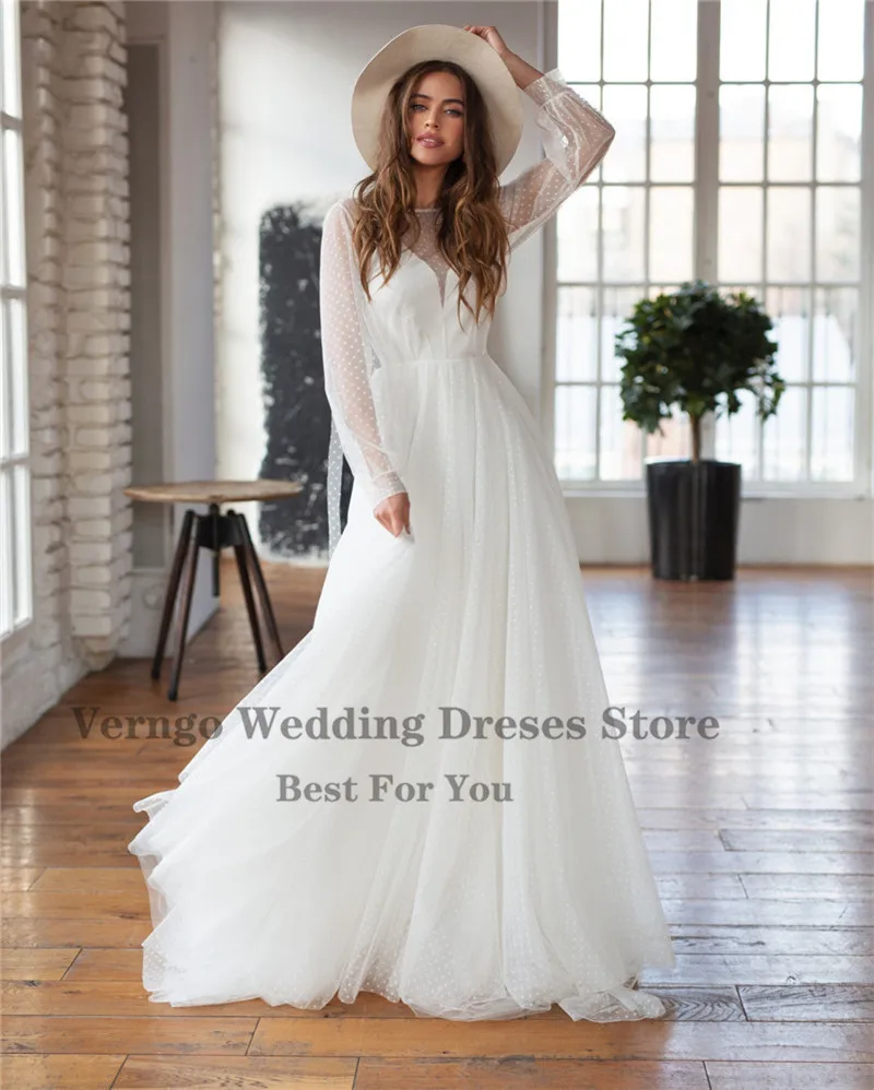 Винтажное Тюлевое платье в горошек Verngo, с длинным рукавом, с воротником Лодочка, ТРАПЕЦИЕВИДНОЕ, в пол, простое свадебное платье, 2021