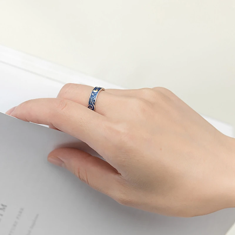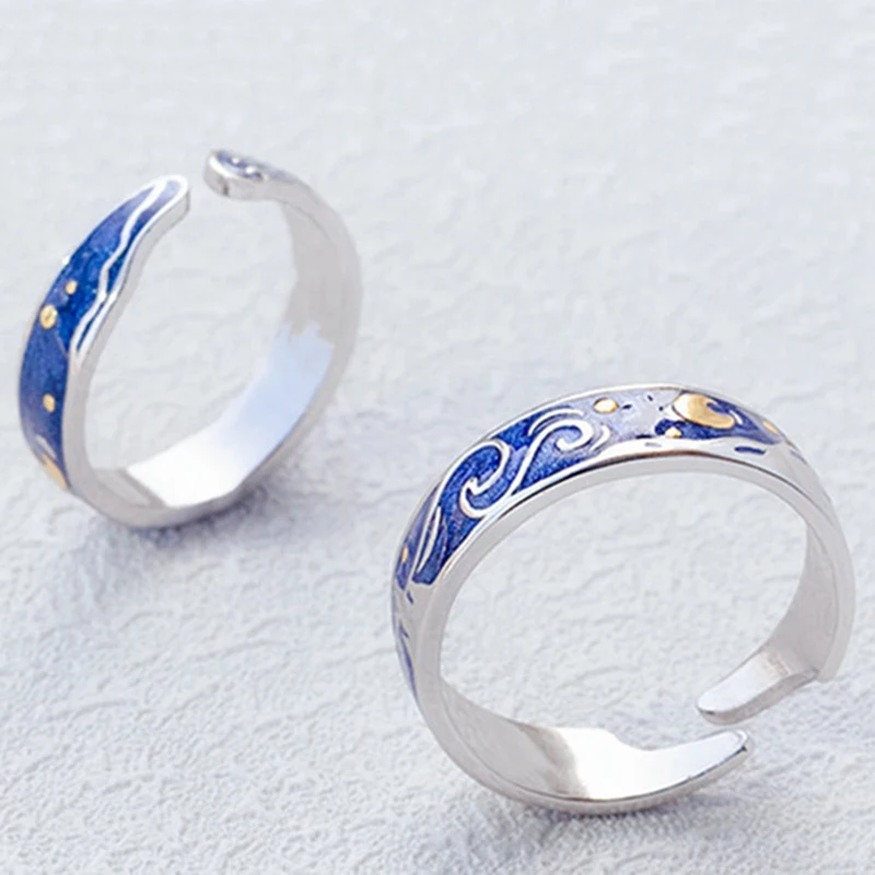 Модные парные кольца с изображением Ван Гога луны и звезд, тибетское серебристое синее Обещание любви, регулируемые парные кольца для женщин