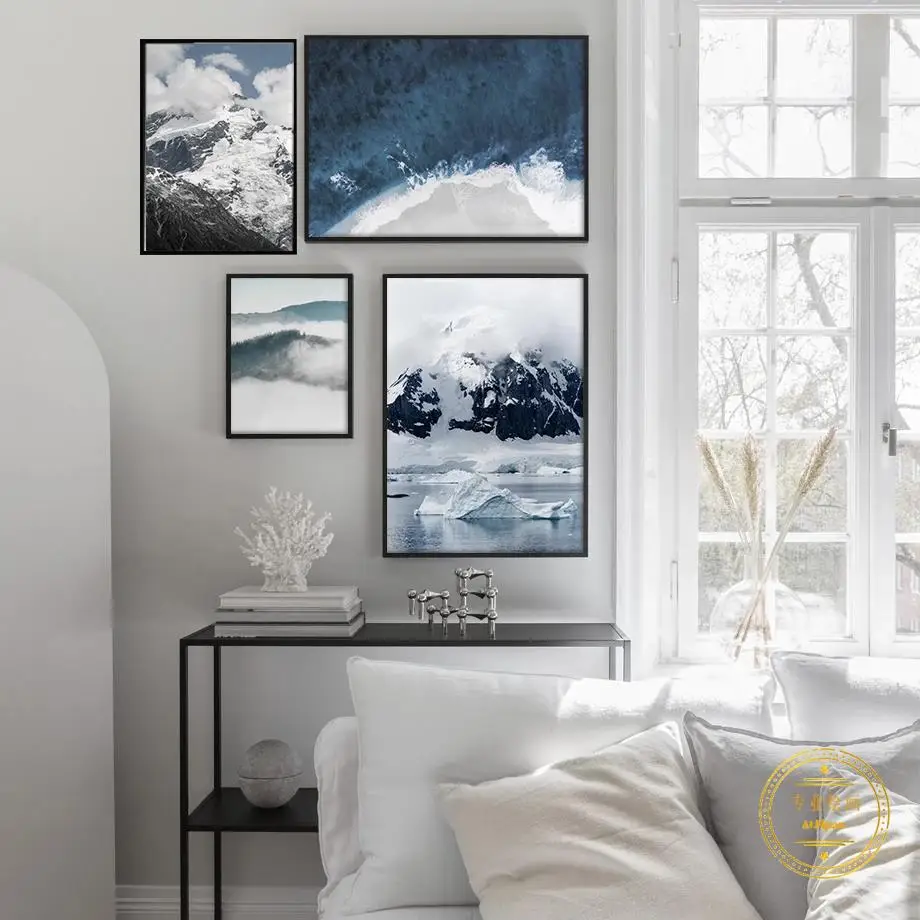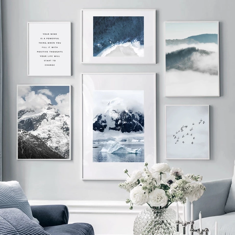 Картина на холсте для гостиной, с изображением снежных гор, птиц, морского неба, постеры с облаками