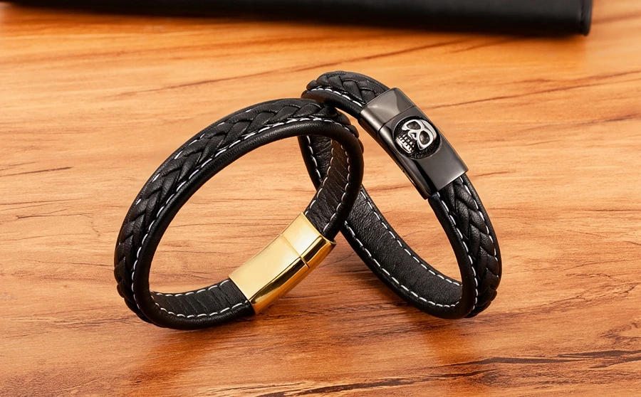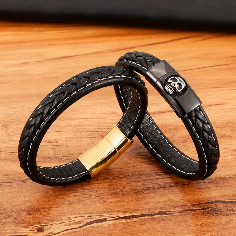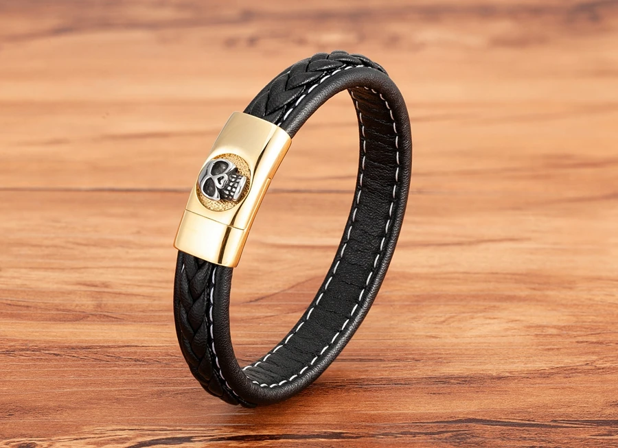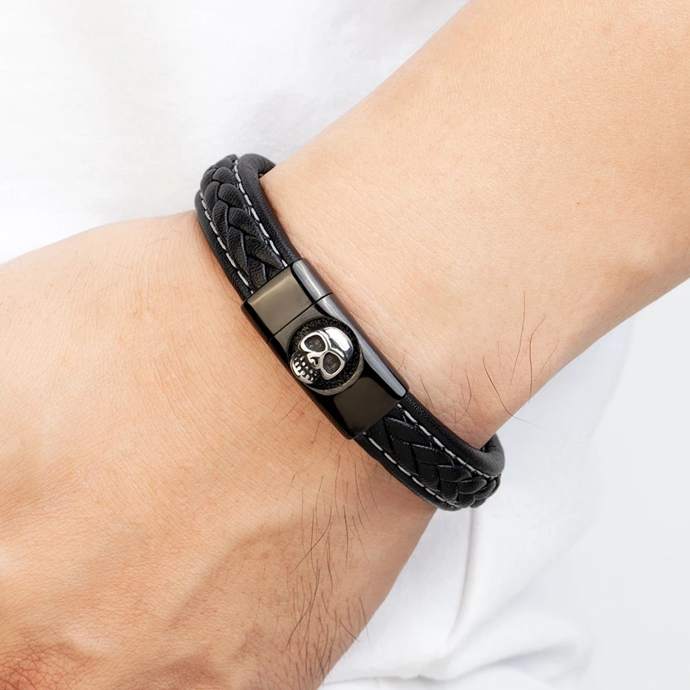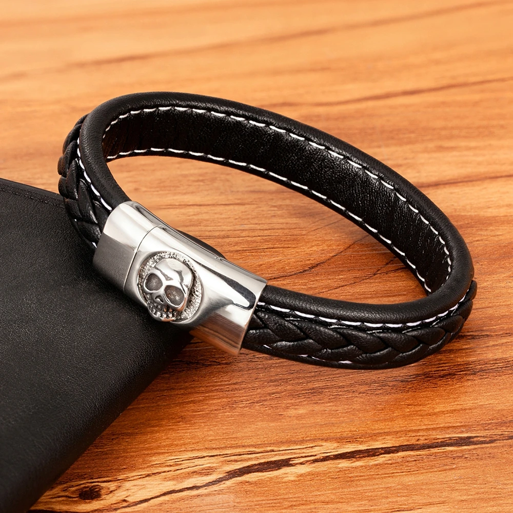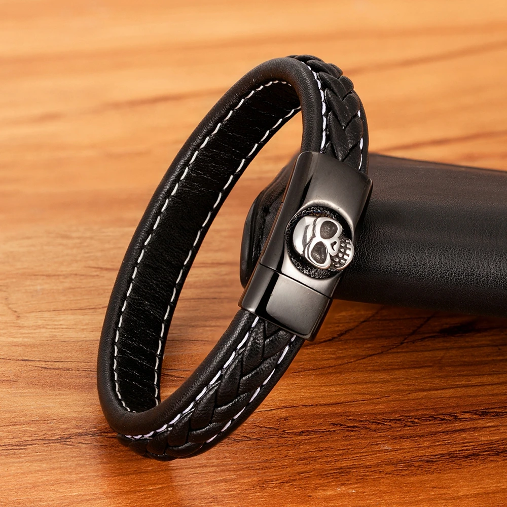 NameSkull Pattern Design Stainless Steel Men's Leather Bracelet