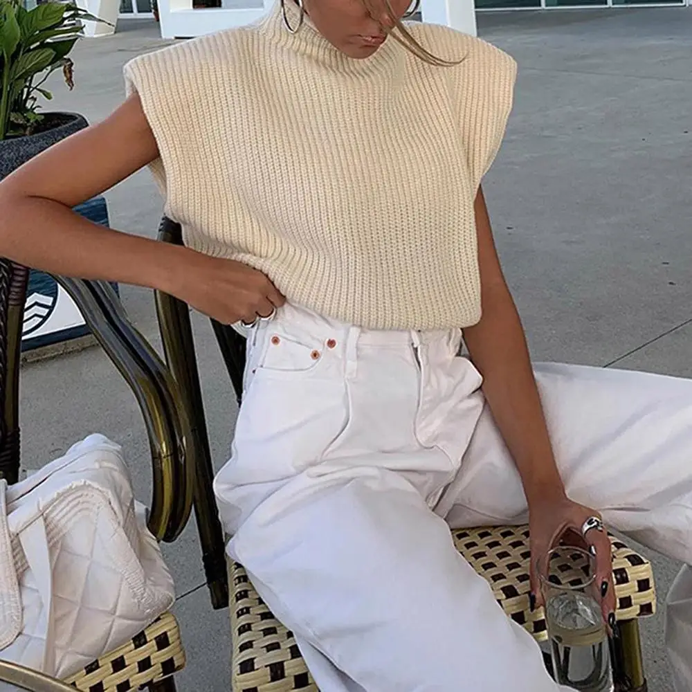 Женский вязаный свитер-водолазка без рукавов, с наплечниками