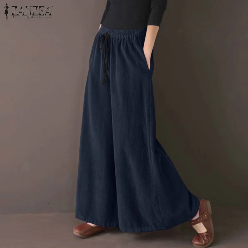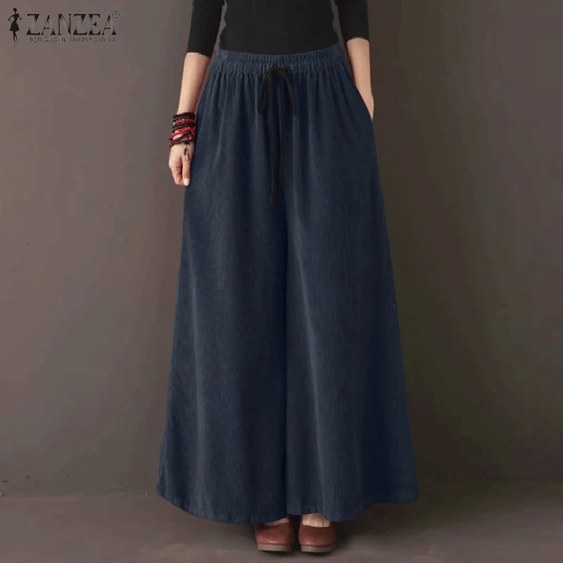 Винтажные вельветовые брюки, женские брюки с широкими штанинами ZANZEA 2021, повседневные брюки на шнуровке, Женские однотонные брюки палаццо с резьбой