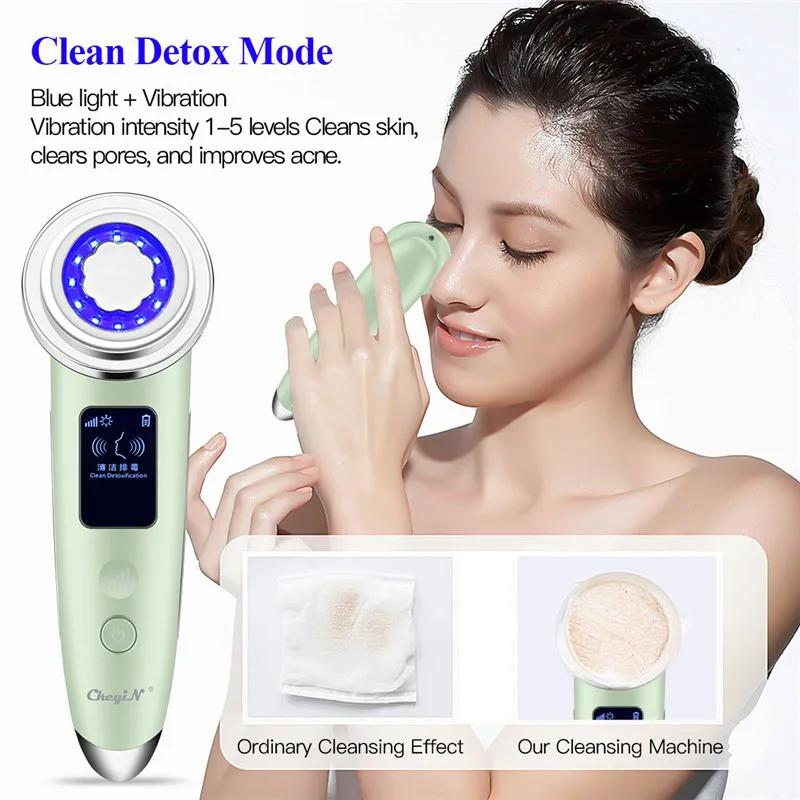 Режим 1: очищение и детоксикация, функция: синий светильник + вибрация, интенсивность вибрации 1-5 уровней. Очищает кожу, очищает поры и улучшает акне.