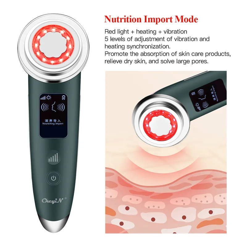 Режим 2: введение питания, функция: Красный светильник + нагрев + вибрация, 5 уровней регулировки вибрации и синхронизации нагрева. Способствует поглощению средств по уходу за кожей, снимает сухость кожи и решает большие поры.