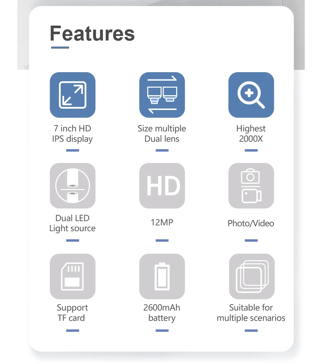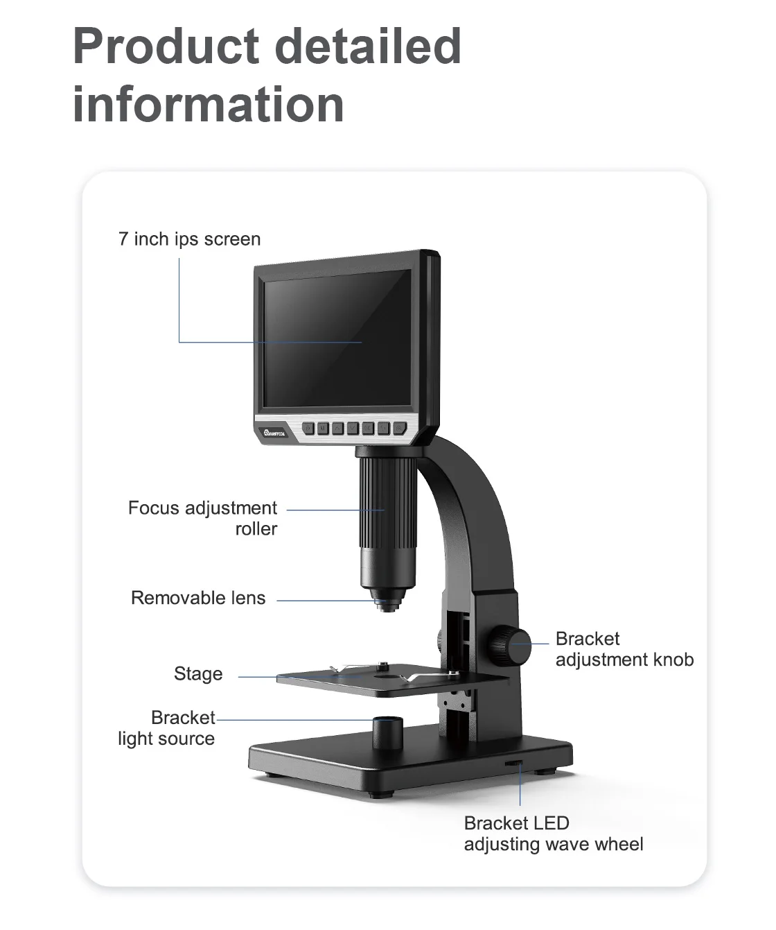 Особенности:Два объектива для различного использования:500X объектив с низким увеличением для обнаружения металла, подходит для технического обслуживания и осмотра монтажной платы, инспекции печати, идентификации нефрита и драгоценных камней и т. д.2000X металлический микроскоп с высоким увеличением, подходит для наблюдения за микробами, наблюдения за секциями, заболеваний растений и насекомых.7-дюймовый высокой четкости IPS большой экран, несколько режимов наблюдения.Поддерживает просмотр компьютера, чем больше экран, тем лучше эффект просмотра.USB DC зарядка и 18650 аккумулятор Двойной режим питания адаптируются к большему количеству сценариев.10 яркий светодиодный светильник s и 1 супер яркий светодиодный светильник, верхний светильник наблюдает за реальным предметом, нижний светильник наблюдает за образцом, изображение более трехмерное и прозрачное.Изготовленная на заказ металлическая распылительная краска Фокусирующая трубка с нежным прикосновением.Нескользящая подкладка для ног добавляется к нижней части, чтобы сделать наблюдение более стабильным.