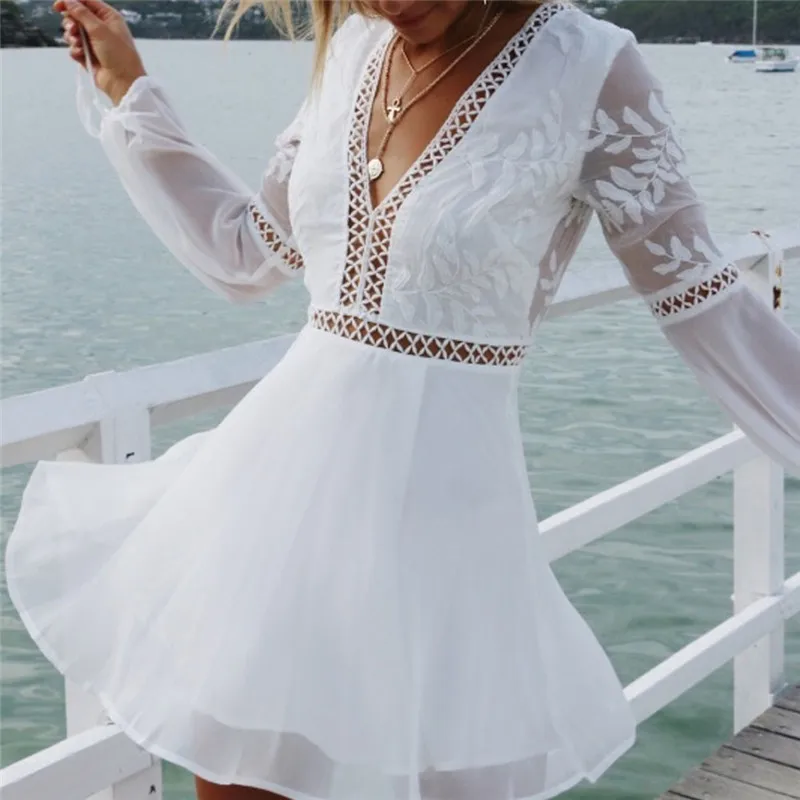 Летнее белое кружевное платье для женщин Мода на каждый день с длинными рукавами и v-образным вырезом, рукав отделка Короткое мини платье Vestido Открытое платье без рукавов