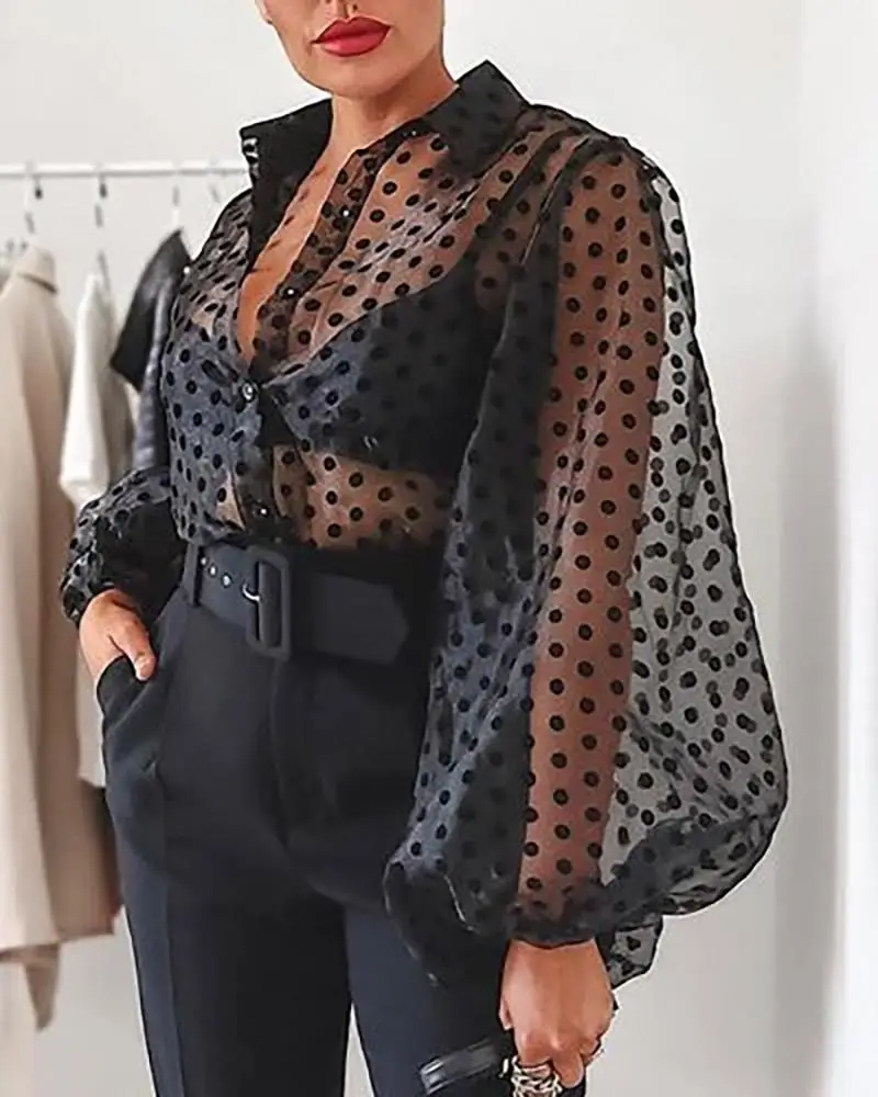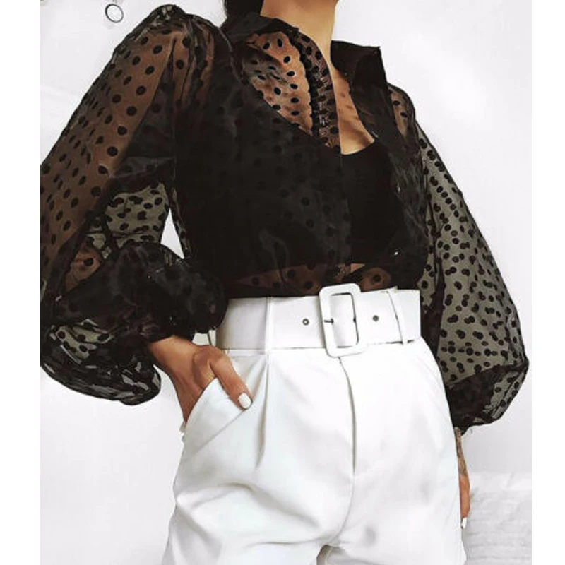 Сексуальные женские сетчатые Прозрачные топы, прозрачная блузка в горошек с длинным рукавом-фонариком и жемчужными пуговицами, прозрачная белая рубашка, женские блузы