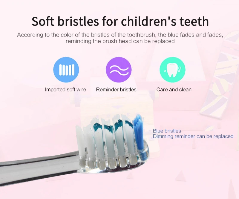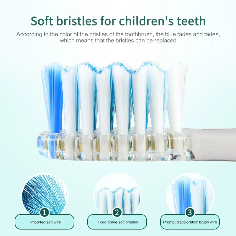 Мягкая щетина DuPont с прозрачным цветом защищает детские зубы, мягко отполируя пятна на поверхности