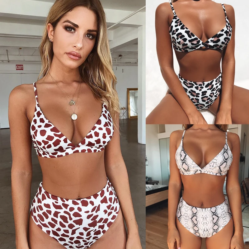 Женский модный комплект бикини с леопардовым принтом и змеиным принтом, бюстгальтер с пуш-ап + трусы с высокой талией, женский летний купальник, пляжная одежда