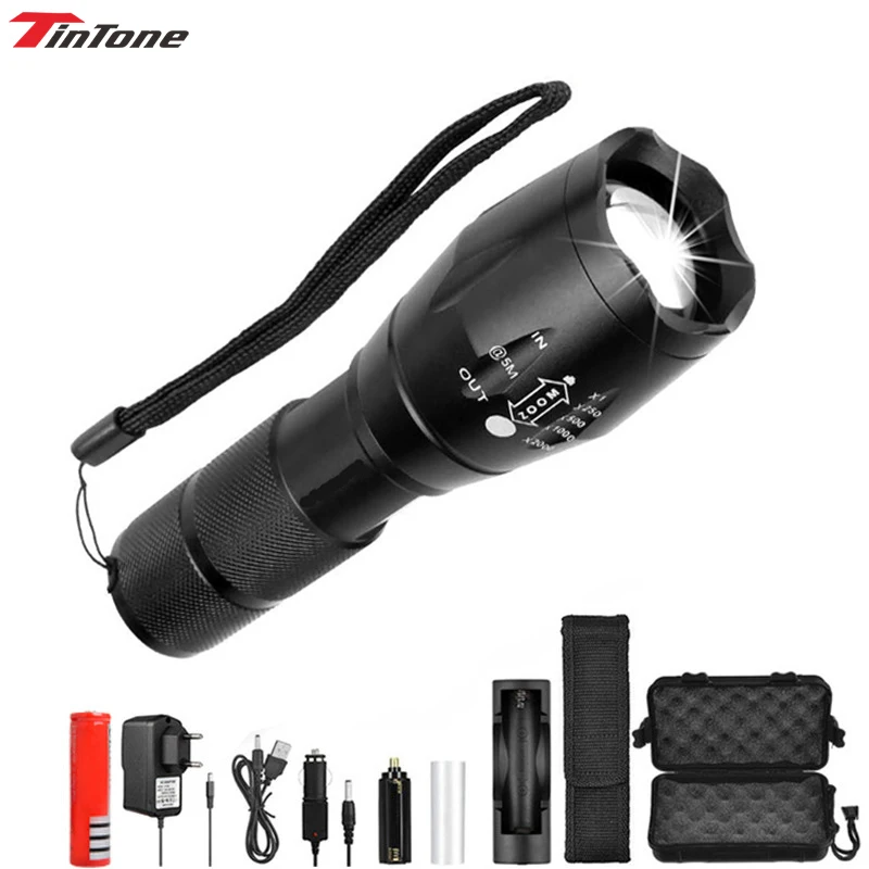 Посылка F: 1 фонарик + 1 перезаряжаемый аккумулятор 18650 + 1 зарядное устройство переменного тока (EU/US/AU/UK) + 1 зарядное устройство USB + 1 автомобильное зарядное устройство + 1 слот для аккумулятора AAA + 1 рукав для аккумулятора 18650 + 1 нейлоновый фонарик