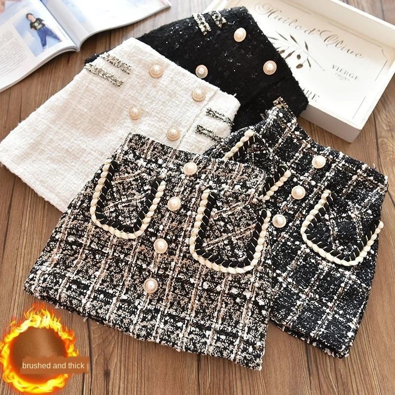 Осенне-зимняя юбка для девочек, детская модная юбка, детские штаны, модная бархатная Теплая юбка с жемчужинами и карманами от 4 до 12 лет