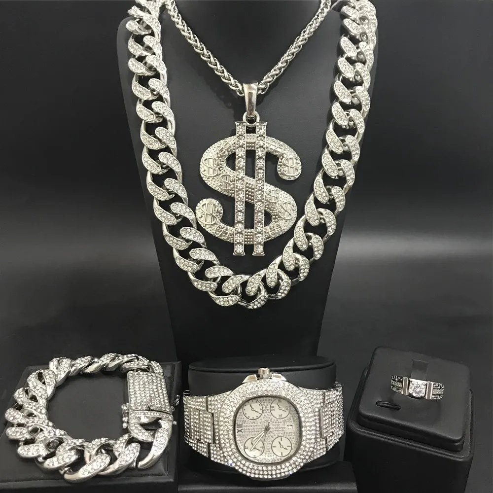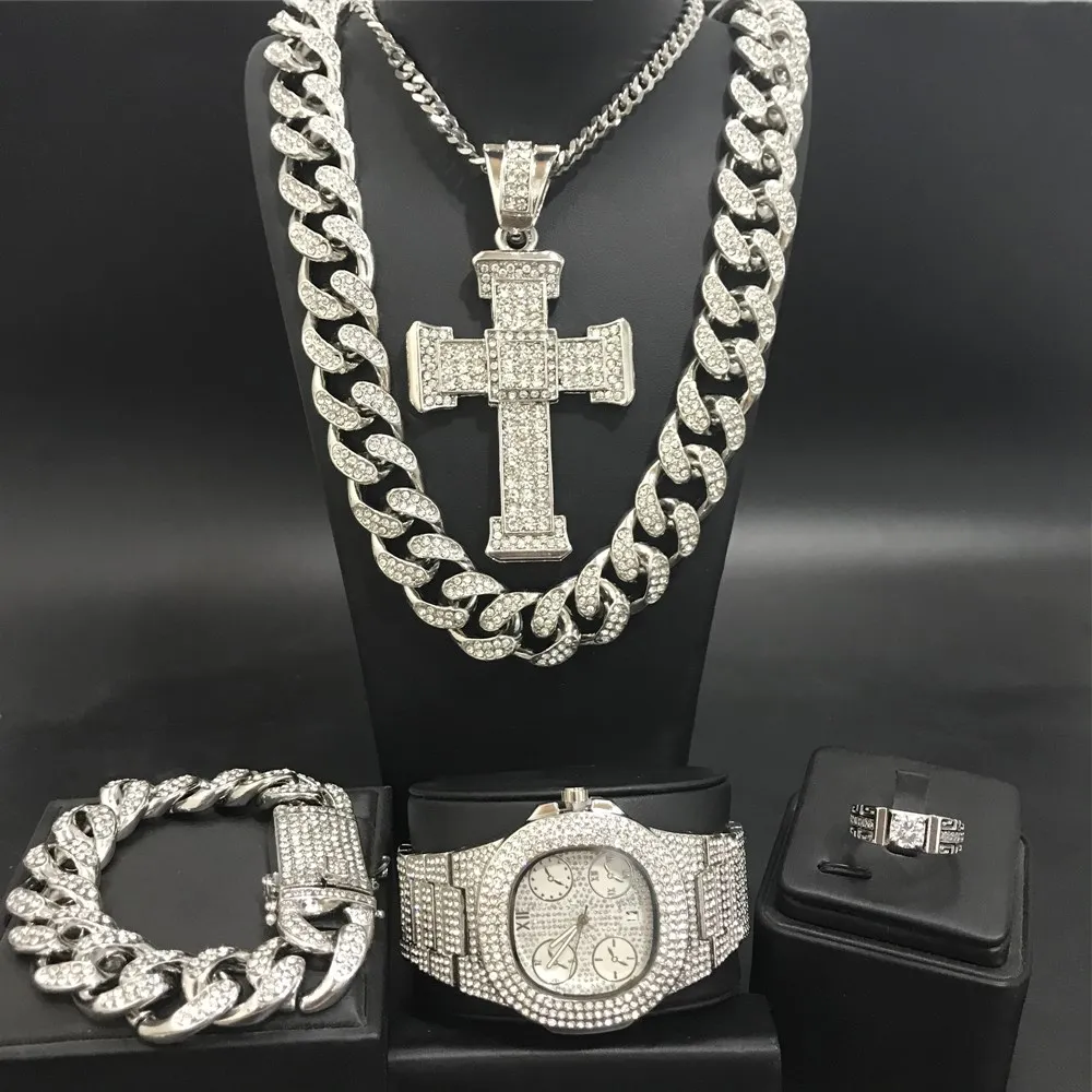 Роскошные мужские часы серебряного цвета, ожерелье, кольцо, серьги и браслеты, комбинированные часы в кристаллах, кубинская цепочка на шею