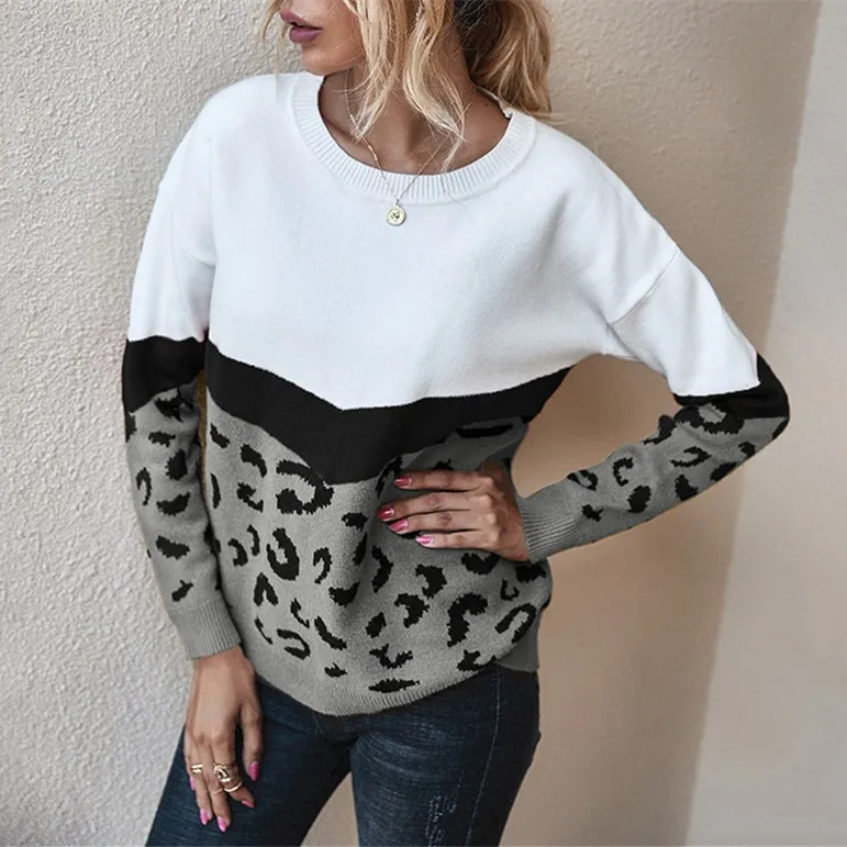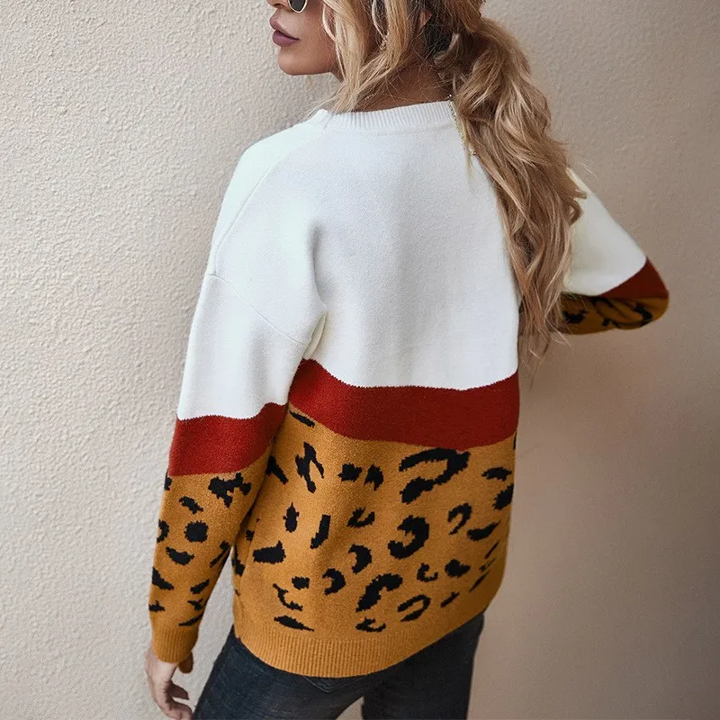 Женский трикотажный свитер с леопардовым принтом, с круглым вырезом и длинным рукавом