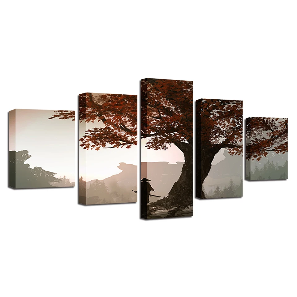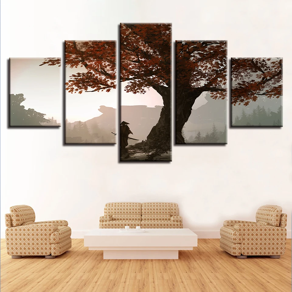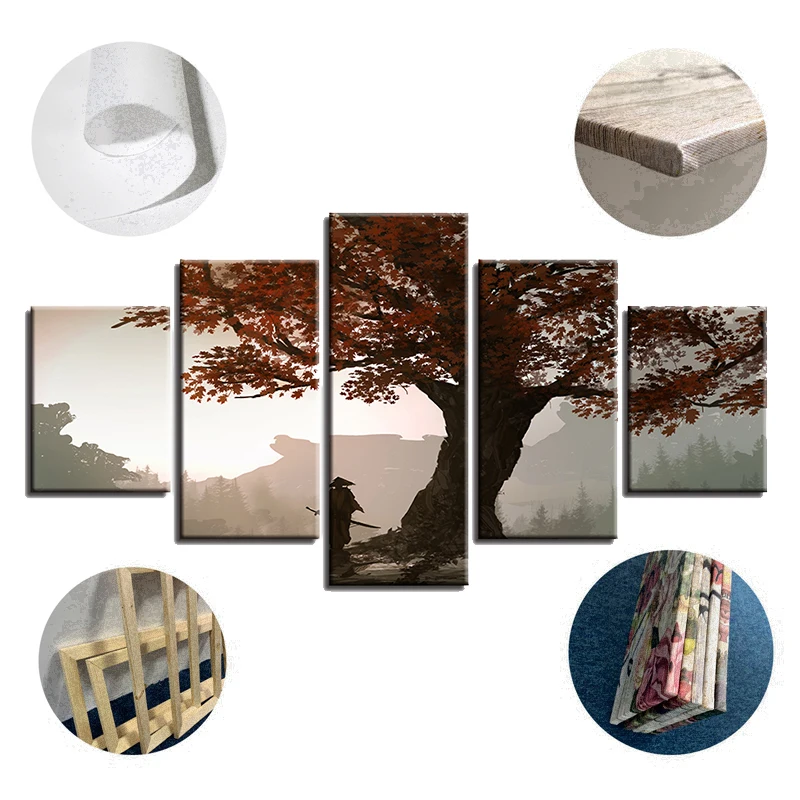 Модульные картины на холсте HD, Декор для дома, 5 шт., аниме картины самурая, настенное искусство, постер с кленовым деревом, рама для гостиной