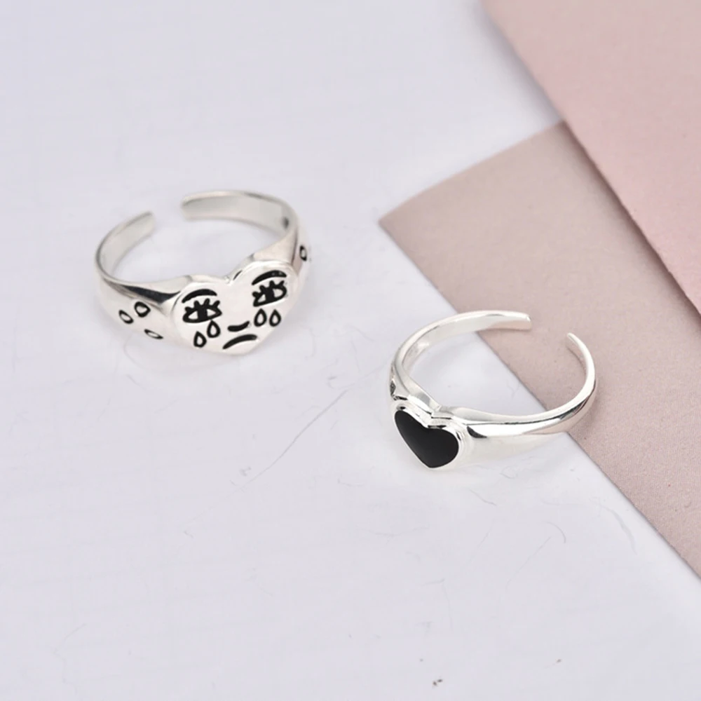 Кольцо женское регулируемое, серебристое, винтажное, с черным сердцем и грустным лицом, для вечерние, 2021