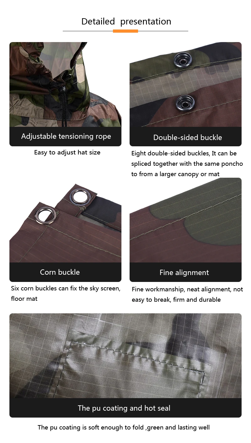 Особенности:Многофункциональный Камуфляжный дождевик, может использоваться как дождевик, коврик для палатки и тент.100% обработанная лента, супер водонепроницаемая во время кемпинга на открытом воздухе, альпинизма, путешествий и т. д.Достаточно большой, чтобы прикрыть рюкзак при использовании в качестве плаща.Он имеет один размер и подходит всем.Можно сложить в небольшую сумку для хранения, легко помещается в рюкзак, перчаточную коробку или карман.Характеристики:Цвет: камуфляжМатериал: 210D полиэстер ТафтаРазмер коврика: прибл. 210*140 смРазмер посылка: прибл. 21*8 см/8,3 * 3.1in (H * D)Общий вес: прибл. 280 гРазмер: Он имеет один размер и подходит всем.Посылка:1 * Многофункциональный плащ1 * сумка для хранения