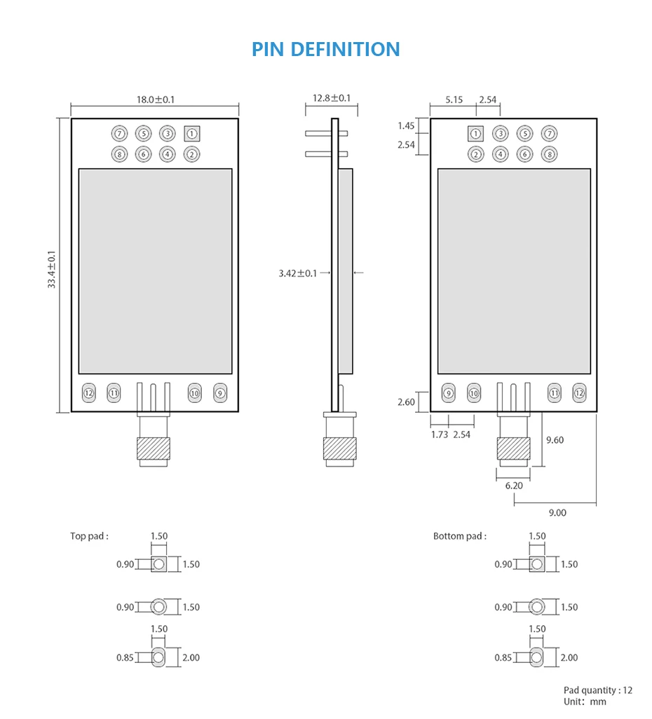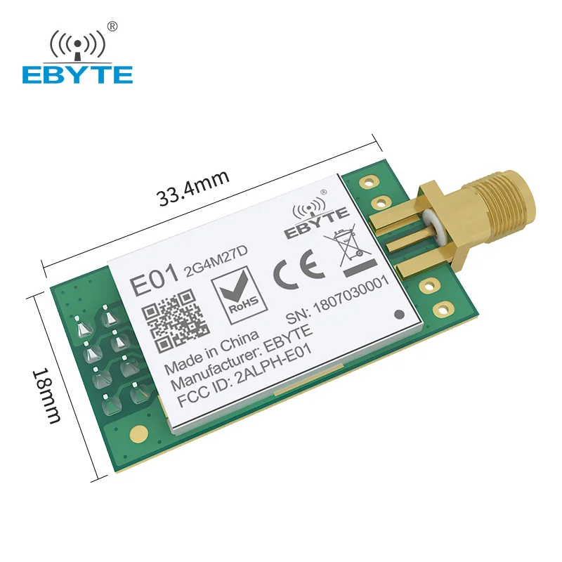 [Введение]: E01 серии 2,4 ГГц беспроводной модуль приемопередатчика исходя из nRF24L01P с SPI интерфейс имеет маленький размер и различные места применения. Модули серии E01 встроены в импортные электронные детали, такие как промышленные Кристаллы с высокой точностью и TCXO