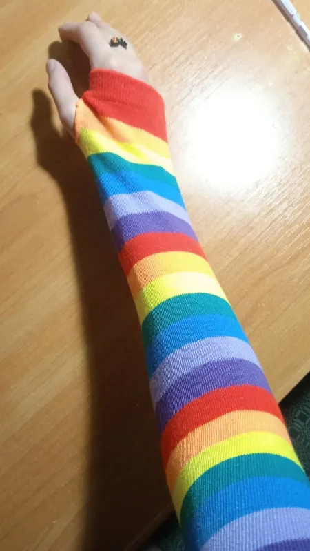 Женские теплые перчатки в стиле Харадзюку до локтя с рукавами без пальцев радужного цвета полосатые вязаные солнцезащитные Костюмные перчатки