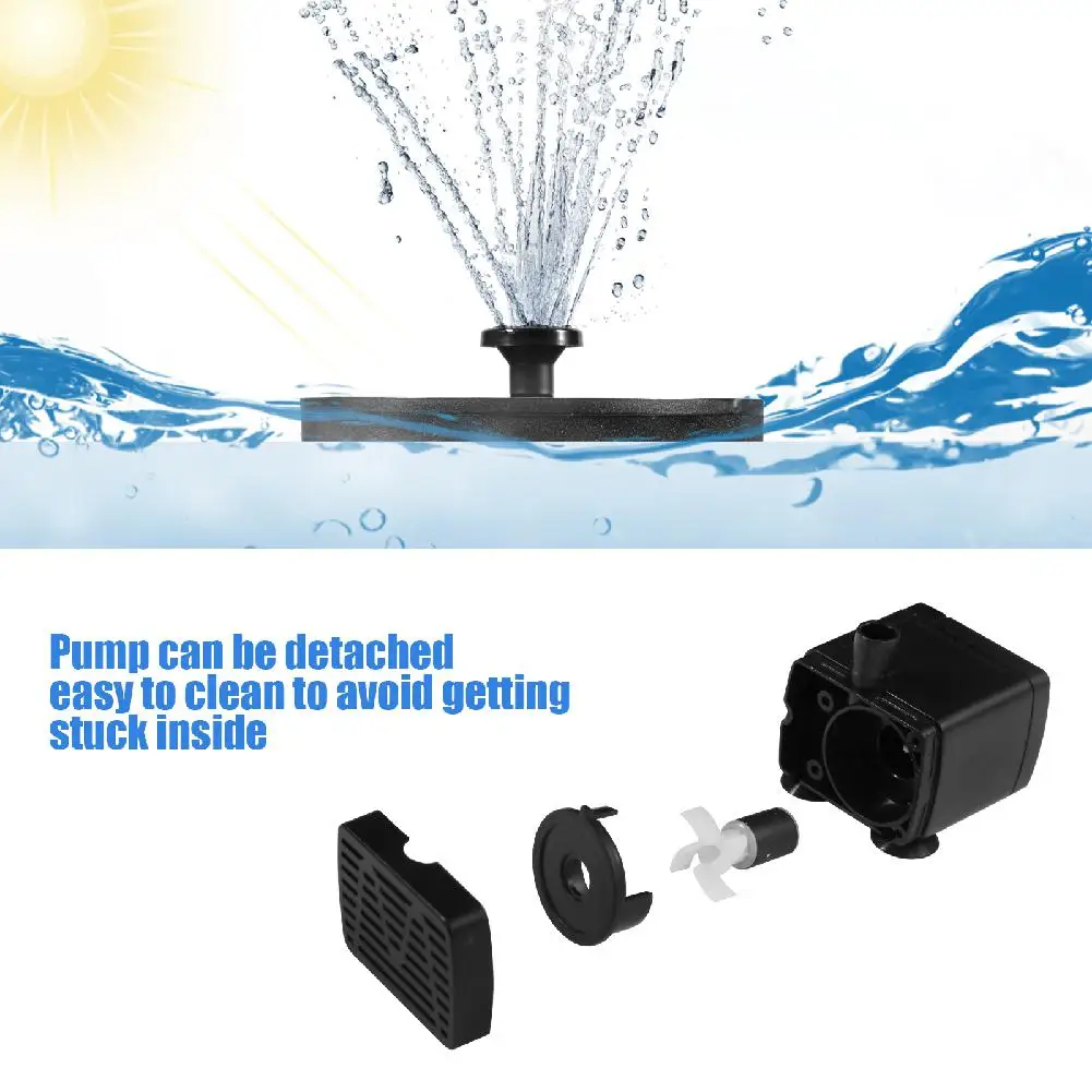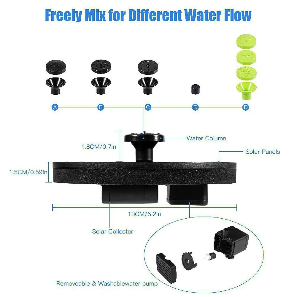 Охрана окружающей среды: солнечные панели очень эффективны. Полностью контролируется солнечной энергией. Аккумулятор или источник питания не требуются. Когда солнце будет заполнено, оно будет работать автоматически в течение 3 секунд. Полностью контролируется солнечной энергией. Это экологически чистый солнечный насос, который может сэкономить затраты. Подходит для различных опрыскивателей воды: сам насос поставляется с 4 видами черных головок сопла (кроме того, случайным образом предоставляется небольшое зеленое сопло в подарок, что дает людям визуально потрясающий эффект распыления, что легче привлечь внимание ваших друзей и подарить вам сюрпризы). Это помогает изменить высоту воды различных режимов воды. Вода может вырасти до 30-60 см приблизительно Различные виды применения: Этот экологически чистый солнечный насос очень подходит для птиц, аквариумов, небольших прудов, бассейнов, садов и циркуляции кислорода. Ваш сад обязательно привлечет внимание прохожих. Этот Солнечный водяной насос делает ваш двор очень очаровательным. Плавучий фонтанный насос: прост в использовании. Вам просто нужно это сделать, и насос плавает на воде. Как только солнечные панели получат солнечный свет. Чем ярче, тем лучше эффект. [Конструкция водяного насоса] выход насоса имеет двойную защиту через дизайн, чтобы предотвратить поломку пряжки и повреждение во время процесса разборки при очистке воды; если пряжка сломана из-за неправильной работы, это не повлияет на нормальное использование. Предложение: Пожалуйста, убедитесь, что в фонтане достаточно воды, чтобы насос полностью держался под водой. Вы должны регулярно чистить насос, чтобы предотвратить блокировку насоса от пыли. Фонтан может работать только тогда, когда все панели подвергаются воздействию прямых солнечных лучей. Солнцезащитный козырек с листьями сделал его непригодным для использования. Не сохраняет никакой энергии.